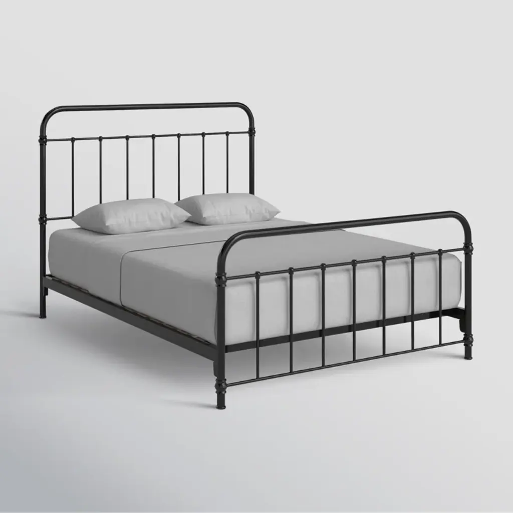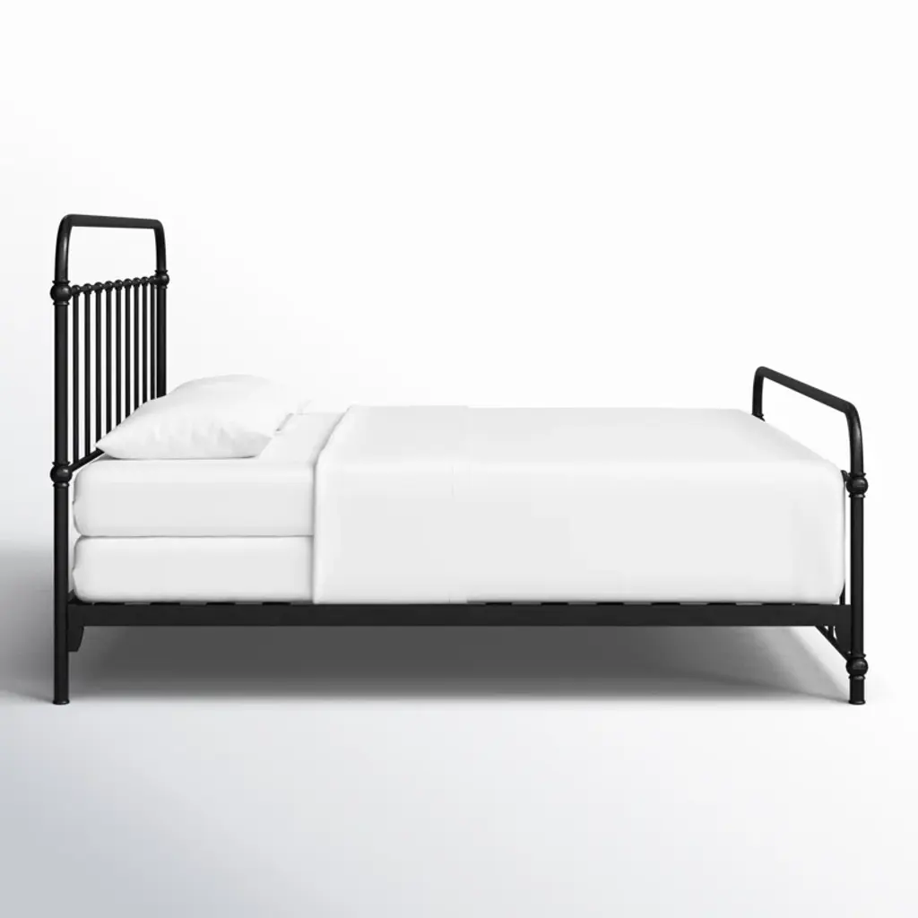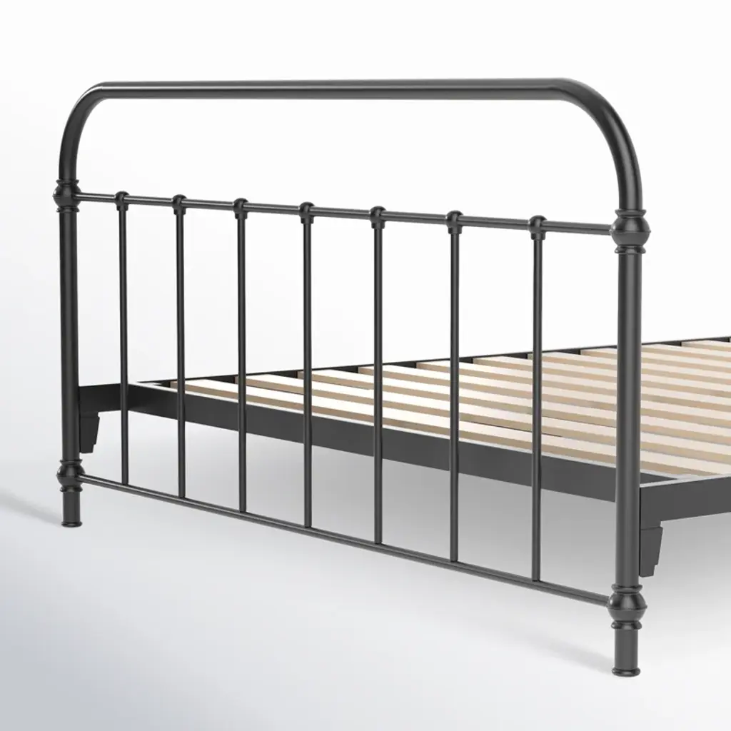 This platform bed is crafted from metal and is available in a range of colorways: Have fun selecting the one that best compliments your design scheme. Its spindle-style headboard and footboard evoke the look of old-fashioned iron beds. Make it up with crisp linens and a quilt coverlet to replicate the vibe! No box spring required – just top with the mattress of your choice (sold separately).
