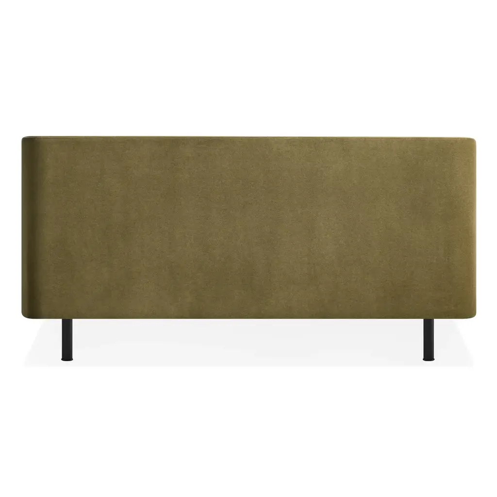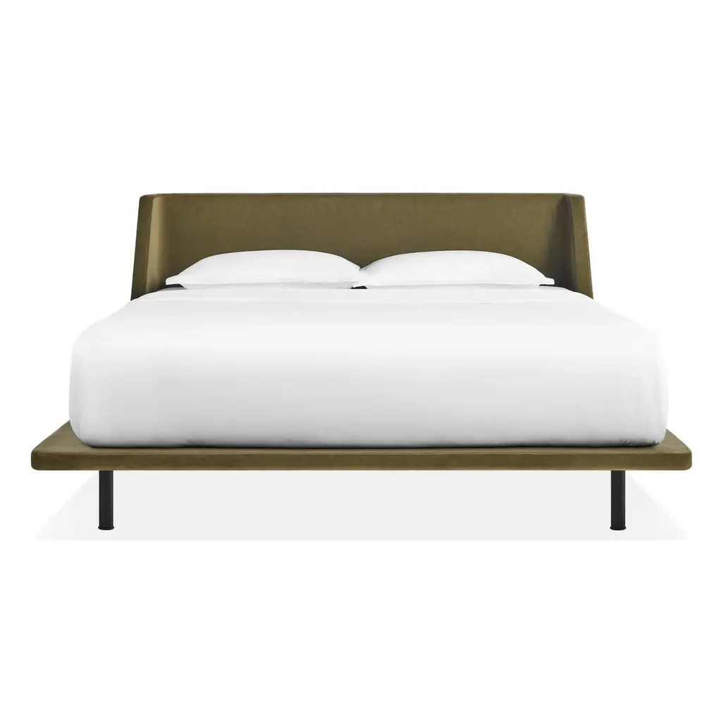 What do you get when a curved, upholstered headboard flows into a slim, padded frame? One seriously good-looking bed. It’s enough to make you want to leave the lights on. Black powder-coated steel legs seem to disappear beneath the bed frame.