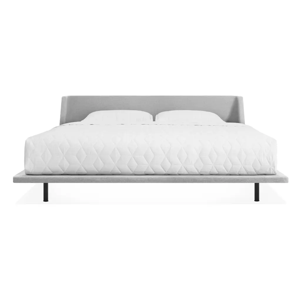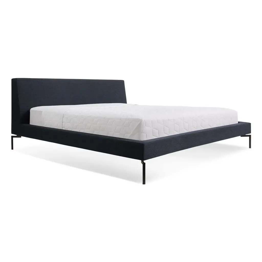 What do you get when a curved, upholstered headboard flows into a slim, padded frame? One seriously good-looking bed. It’s enough to make you want to leave the lights on. Black powder-coated steel legs seem to disappear beneath the bed frame.