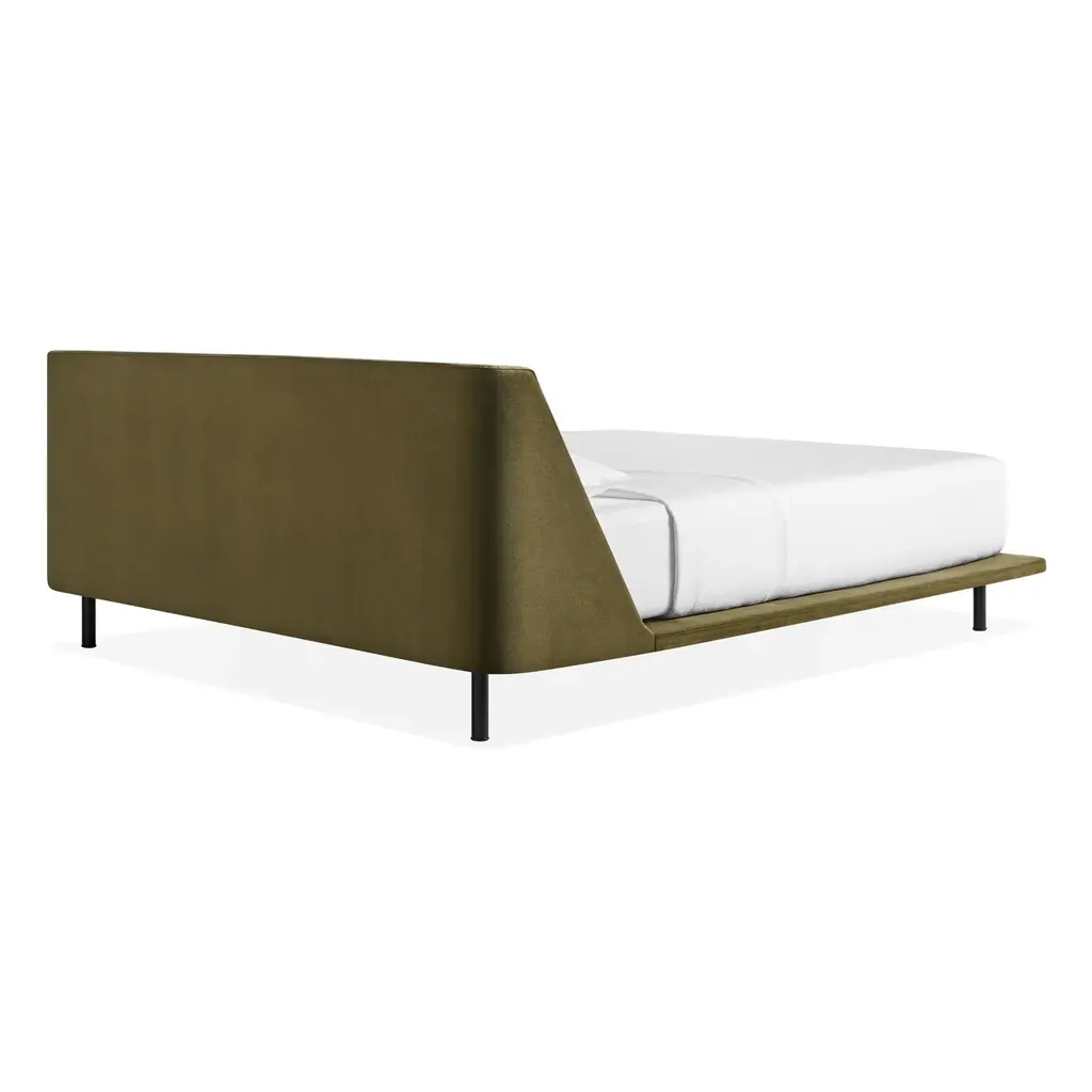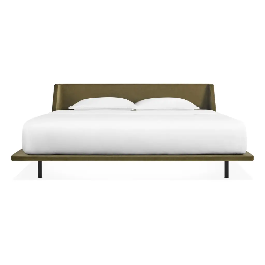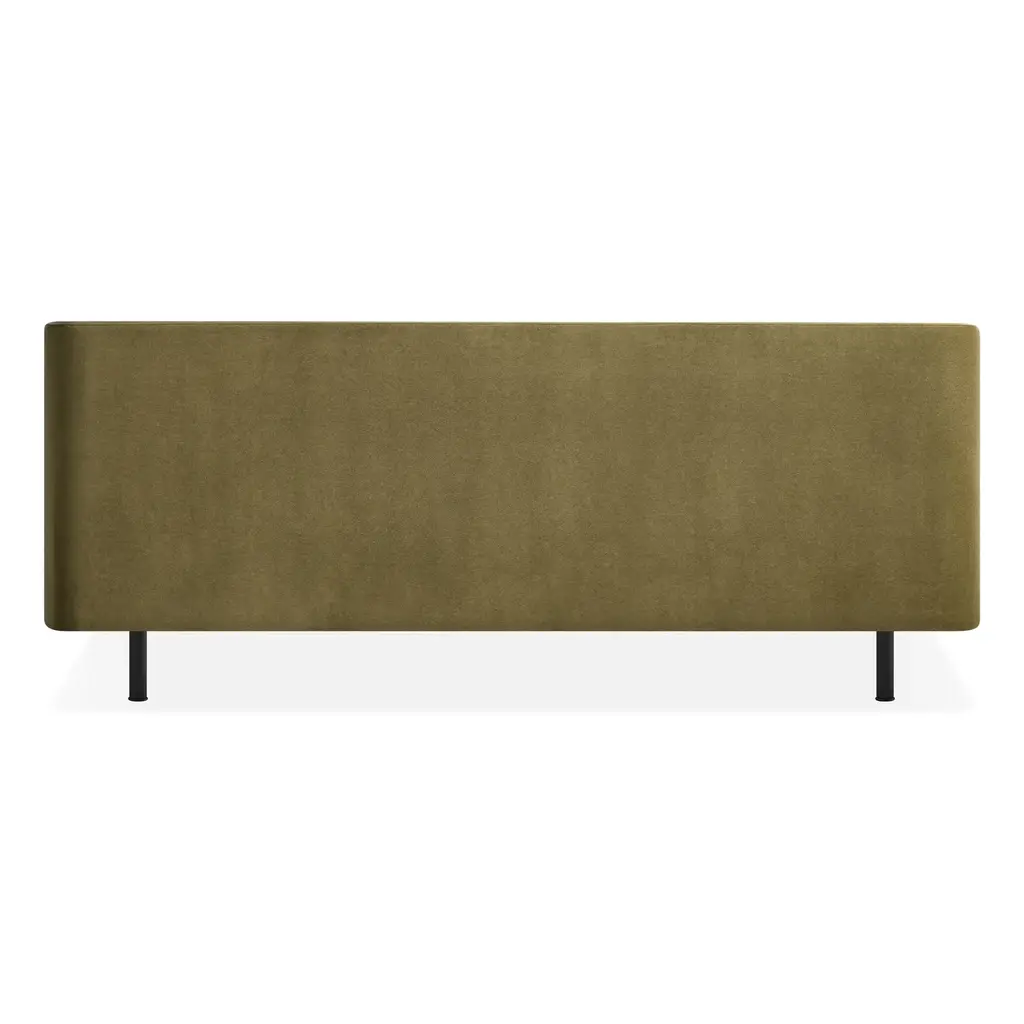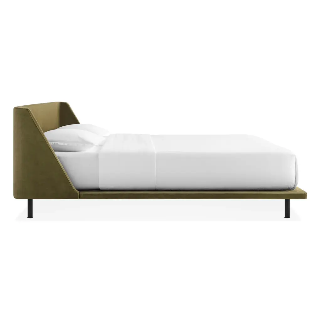 What do you get when a curved, upholstered headboard flows into a slim, padded frame? One seriously good-looking bed. It’s enough to make you want to leave the lights on. Black powder-coated steel legs seem to disappear beneath the bed frame.