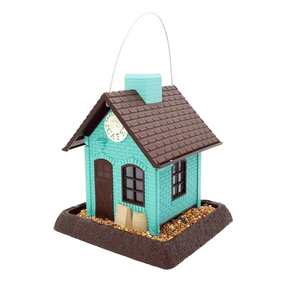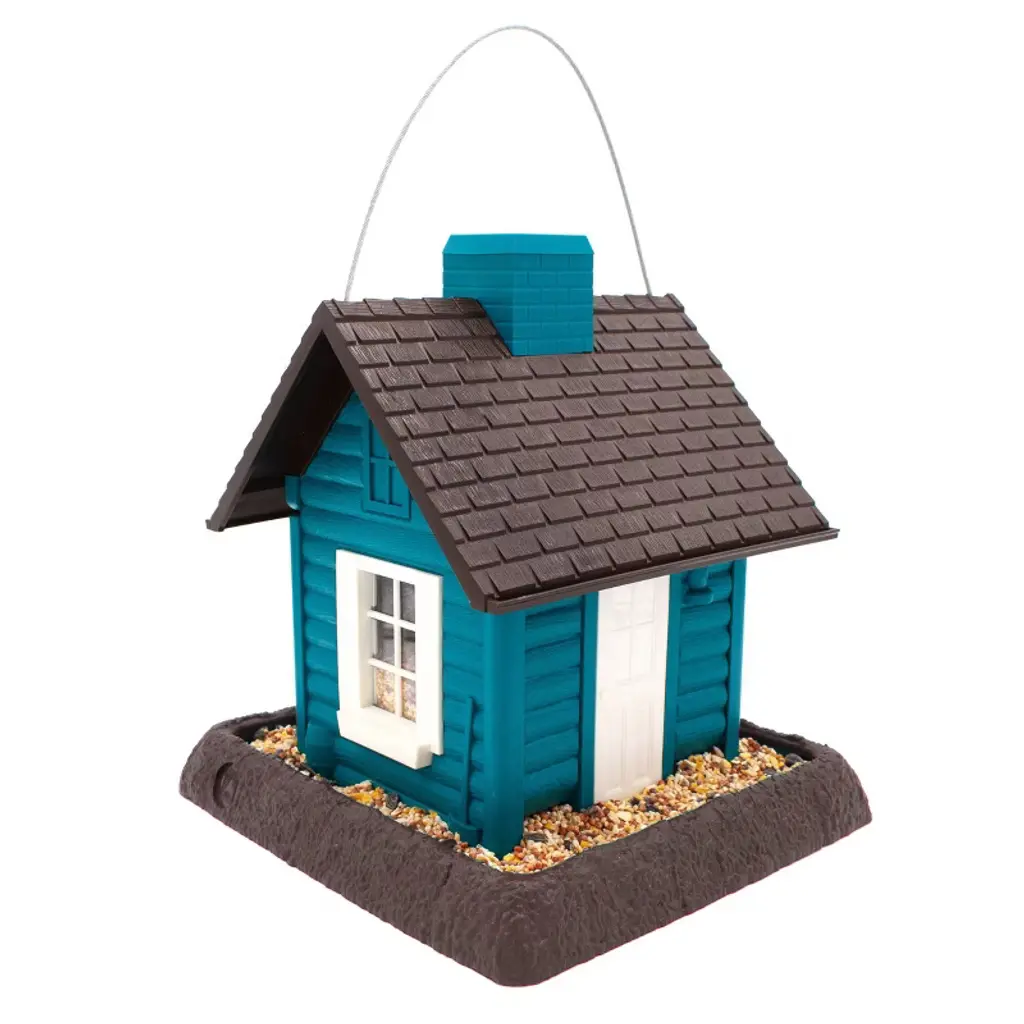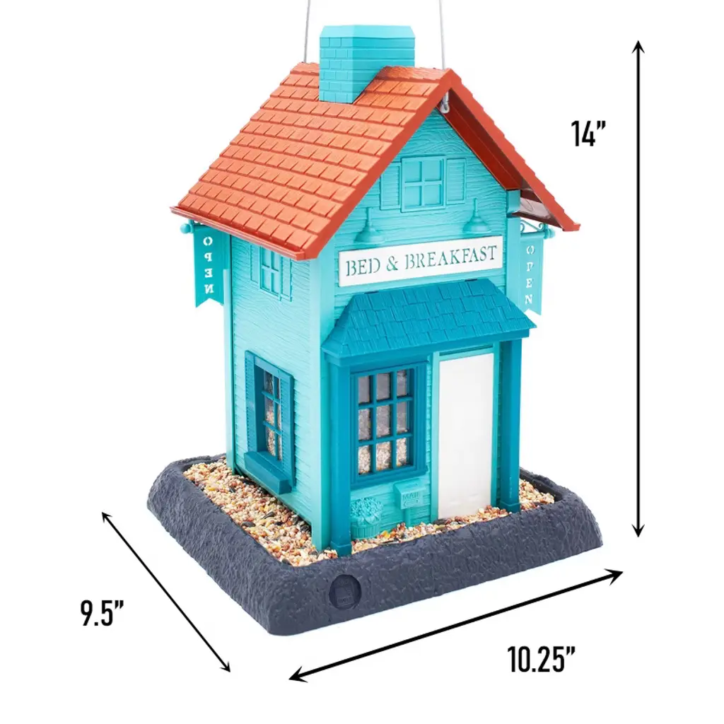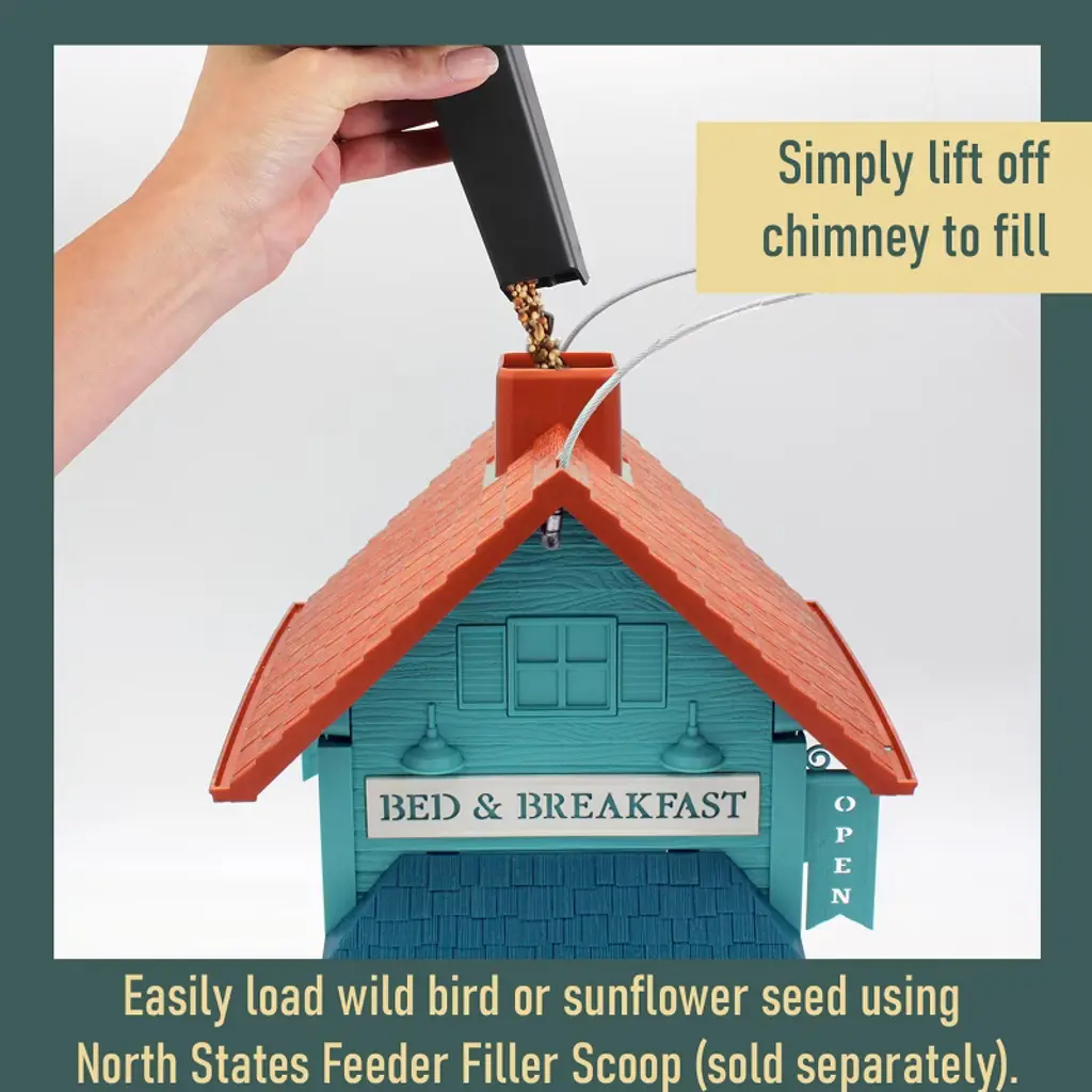 Cardinals, finches, chickadees and more will all want to eat at the cozy Bed & Breakfast. This feeder is part of our extensive North States Village Collection that are all are proudly made in the USA and offers a three year warranty. Made of durable plastic that will last for years to come, it features a beautiful copper color roof with tiffany blue siding and dark teal trim, as well as welcoming details like a molded mailbox and flowerpot, ‘Bed & Breakfast’ and ‘OPEN’ signs. This large capacity hopper style feeder holds an extra-large 6.5 lbs. of wildbird or sunflower seed. It is easy to clean by removing the large tray/perch, easy to refill with the lift-off chimney for mess-free pouring, and features clear plastic windows for monitoring seed levels. This versatile feeder can either be used as a hanging birdfeeder or pole mounted. It measures 9.5 x 10.25 x 14 inches high which is the perfect size for birds of all types.