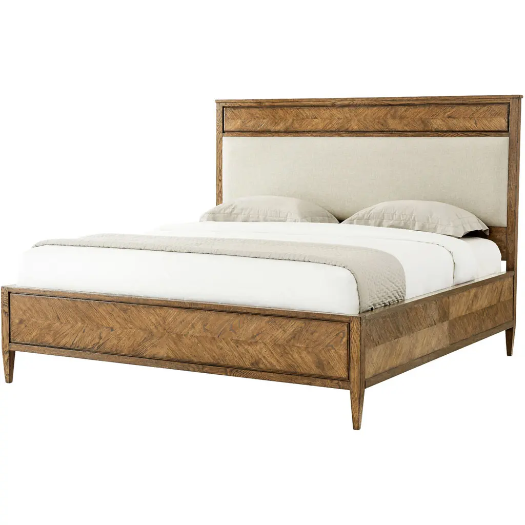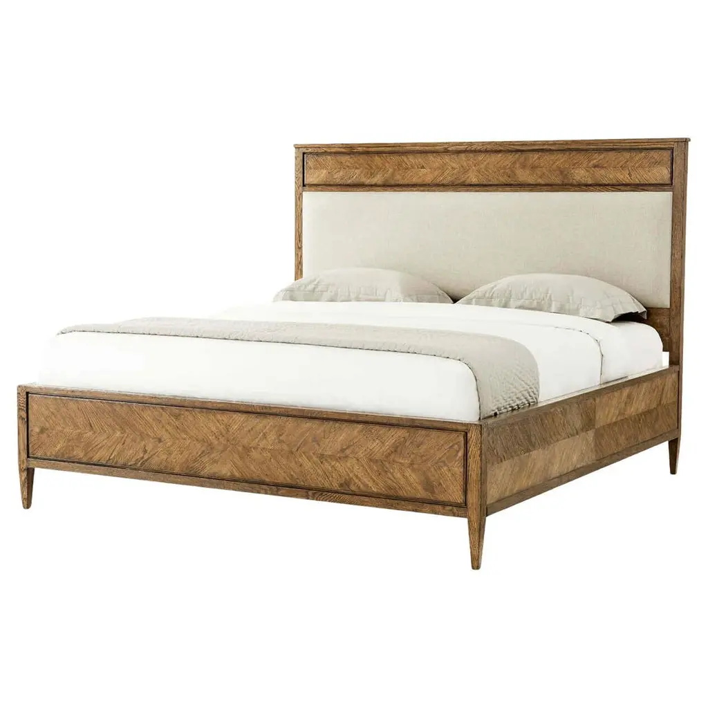 An undeniable super NOVA, this rustic oak design of the NOVA US King Bed, seen in our Dusk finish, captures the essence of a classic silhouette, with a hand-carved starburst design. Featuring an upholstered panel headboard with a framed oak side rail and tapered finished leg.