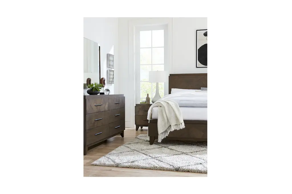 Constructed from a black walnut and mahogany blend, the Oakhill Bed features a boxy, angular form with an abstract, geometric design. Its rich brown finish and gently tapered legs give it a distinctly Mid-Century Modern touch. This bed is best paired with a low-profile 5-inch box spring, but the removable side rail cleat also allows for compatibility with standard adjustable mattress bases.