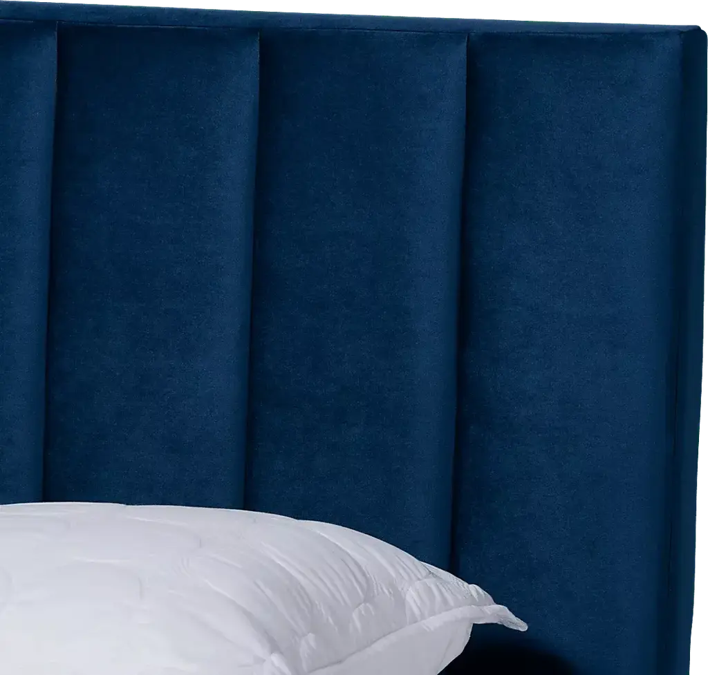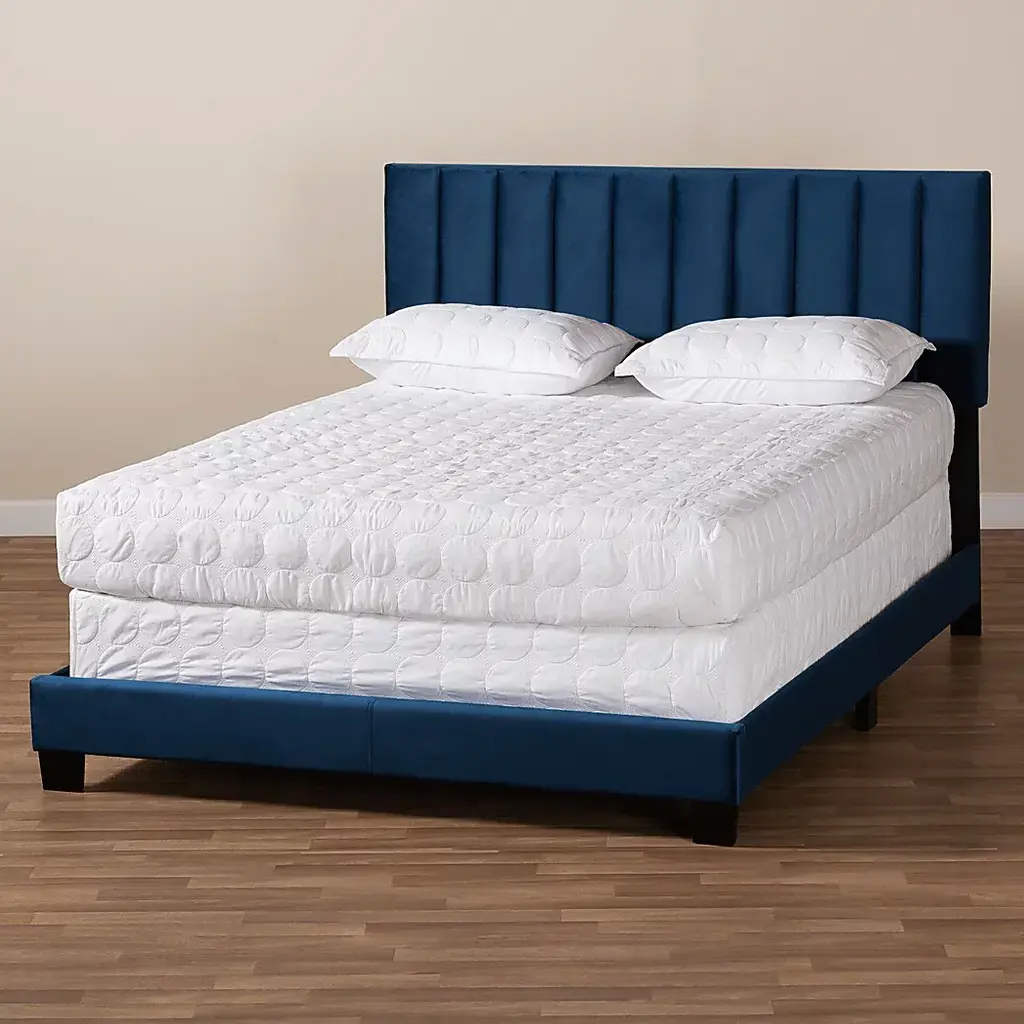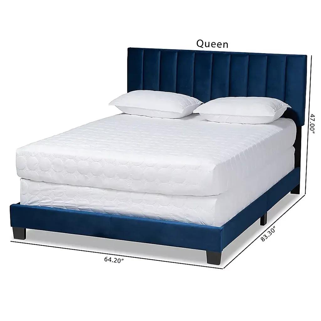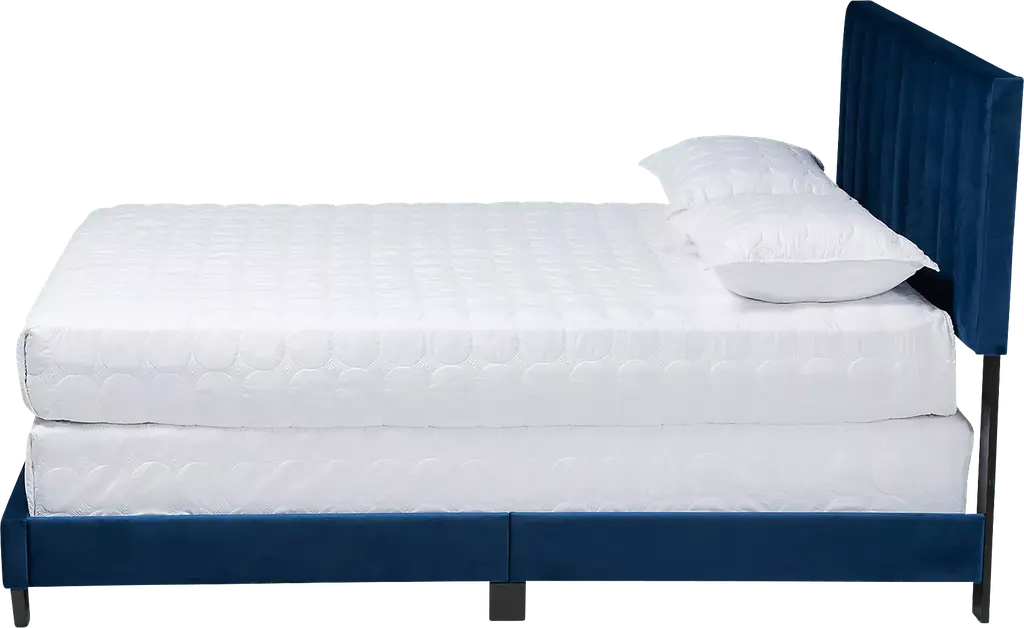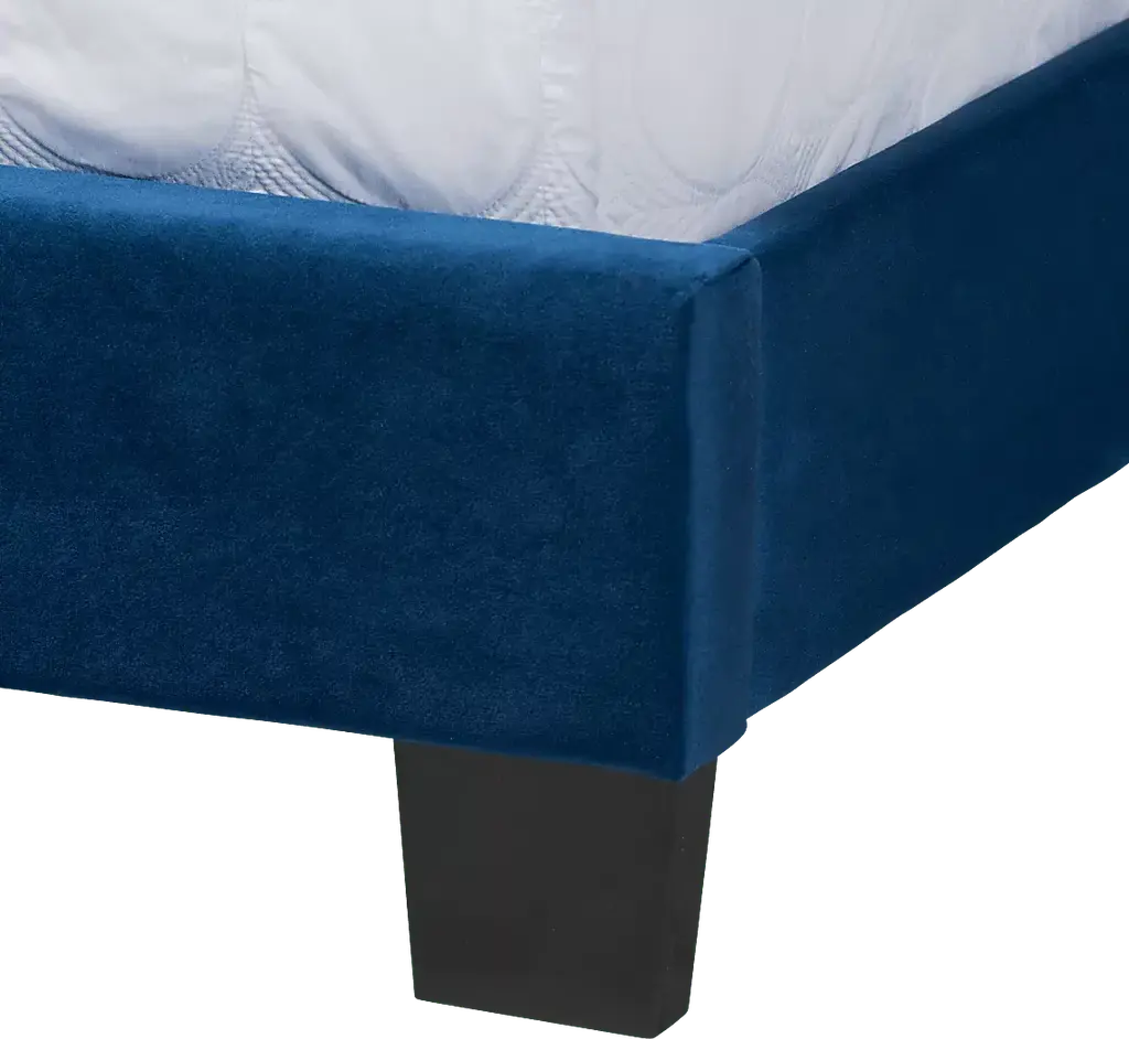 With its chic headboard, the Oaksys navy queen bed adds a striking look to any bedroom. Set on top of solid black wood legs, the Oaksys is upholstered in a soft, luxurious velvet fabric that feels exceptionally soft to the touch. Its glamorous channel tufted headboard forms an impressive backdrop in even the simplest of spaces. Add a set of crisp white sheets and plush duvet to complete the look. This bed requires a box spring for use. Customer assembly is required.