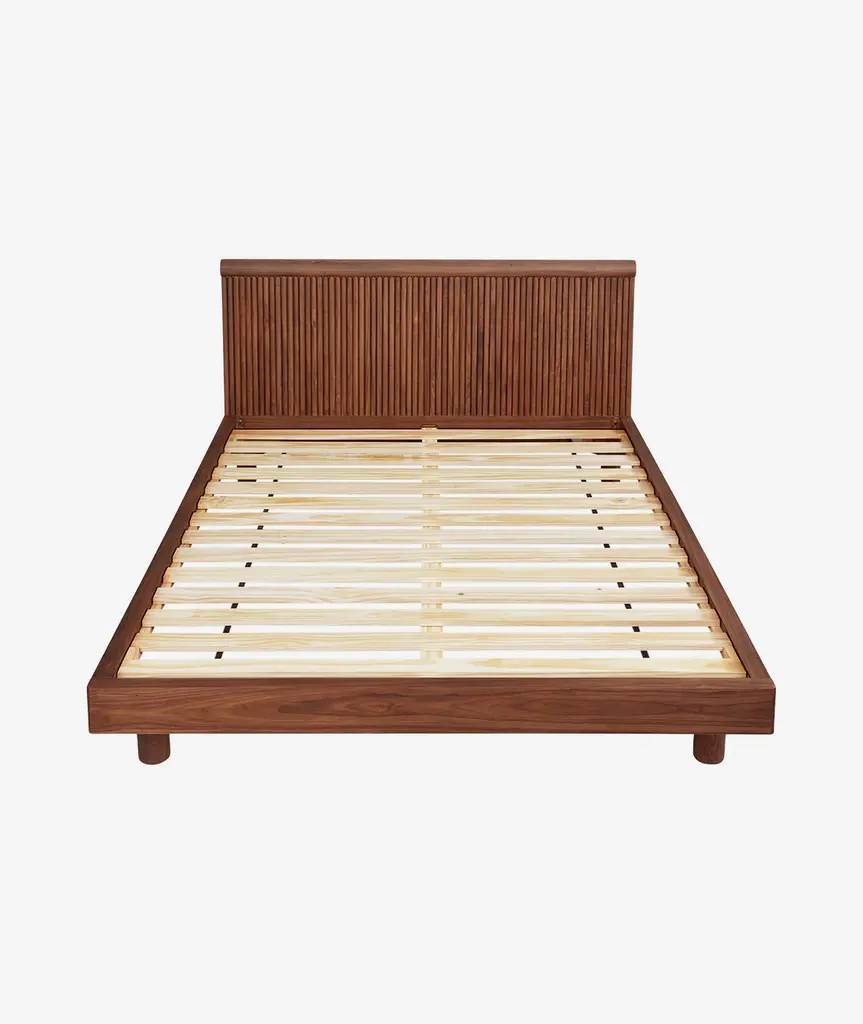 Neo‐Classical forms get a contemporary treatment with the Odeon Bed, which evokes Doric columns and a sculptural dynamism. From every angle, this design reveals qualities that gently juxtapose and interplay: a scalloped headboard with a solid wood mantle; textured, organic wood grain; soft curves balanced by chiseled lines. The warm wood surface is finished by hand with a durable, all-natural matte stain, chosen to enhance the unique characteristics of the grain. Match with our Odeon End Tables for a cohesive look.