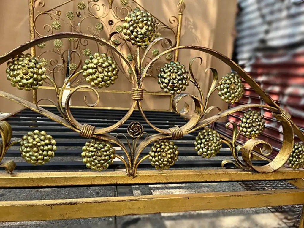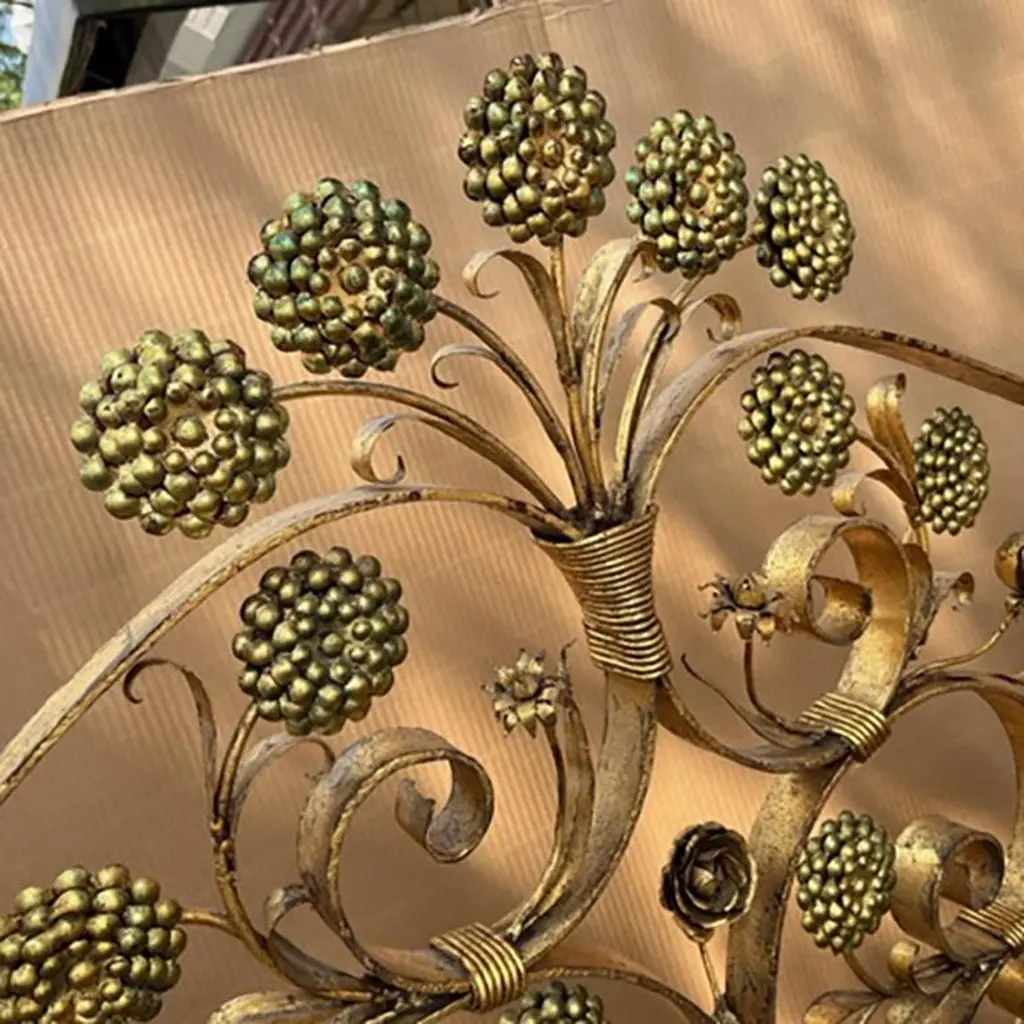 Pair of circa 1940's Venetian gilt metal beds with floral motif on head and foot boards. These fit a queen size mattress.Measurements:Height of heading: 65"Height of footboard: 33"Width: 62"Depth: 82"