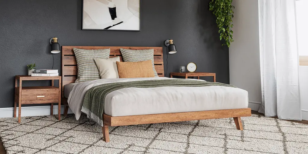Sturdy wood construction meets airy lightness. Palder Bed features a low base that appears to float off the floor, with a slatted frame and headboard for an open look and ample airflow. A perfect foundation for comfort and serenity in your bedroom. Handcrafted and made to order in the US in your chosen size and wood finish.Crafted in your choice of beautiful, 100% solid hard White Oak, White Maple, American Walnut, or Black Oak. Solid wood slats are spaced to support the mattress while allowing ample airflow.