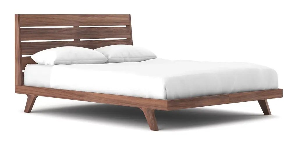 Sturdy wood construction meets airy lightness. Palder Bed features a low base that appears to float off the floor, with a slatted frame and headboard for an open look and ample airflow. A perfect foundation for comfort and serenity in your bedroom. Handcrafted and made to order in the US in your chosen size and wood finish.Crafted in your choice of beautiful, 100% solid hard White Oak, White Maple, American Walnut, or Black Oak. Solid wood slats are spaced to support the mattress while allowing ample airflow.