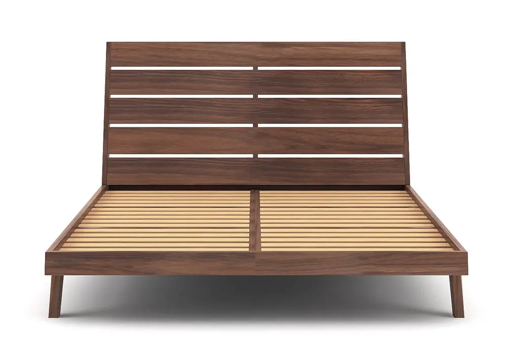 Sturdy wood construction meets airy lightness. Palder Bed features a low base that appears to float off the floor, with a slatted frame and headboard for an open look and ample airflow. A perfect foundation for comfort and serenity in your bedroom. Handcrafted and made to order in the US in your chosen size and wood finish.Crafted in your choice of beautiful, 100% solid hard White Oak, White Maple, American Walnut, or Black Oak. Solid wood slats are spaced to support the mattress while allowing ample airflow.