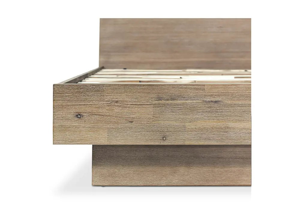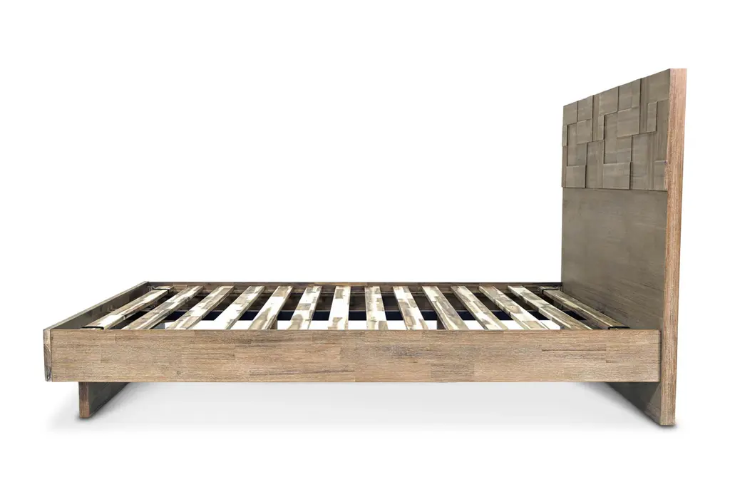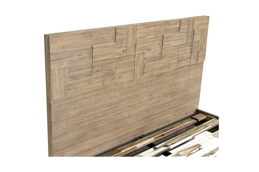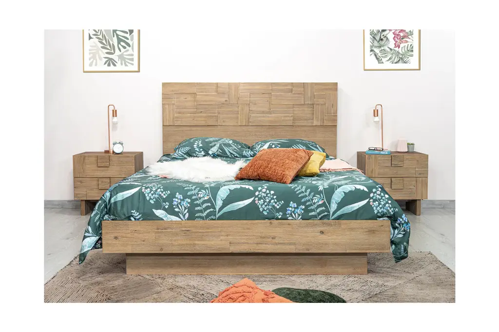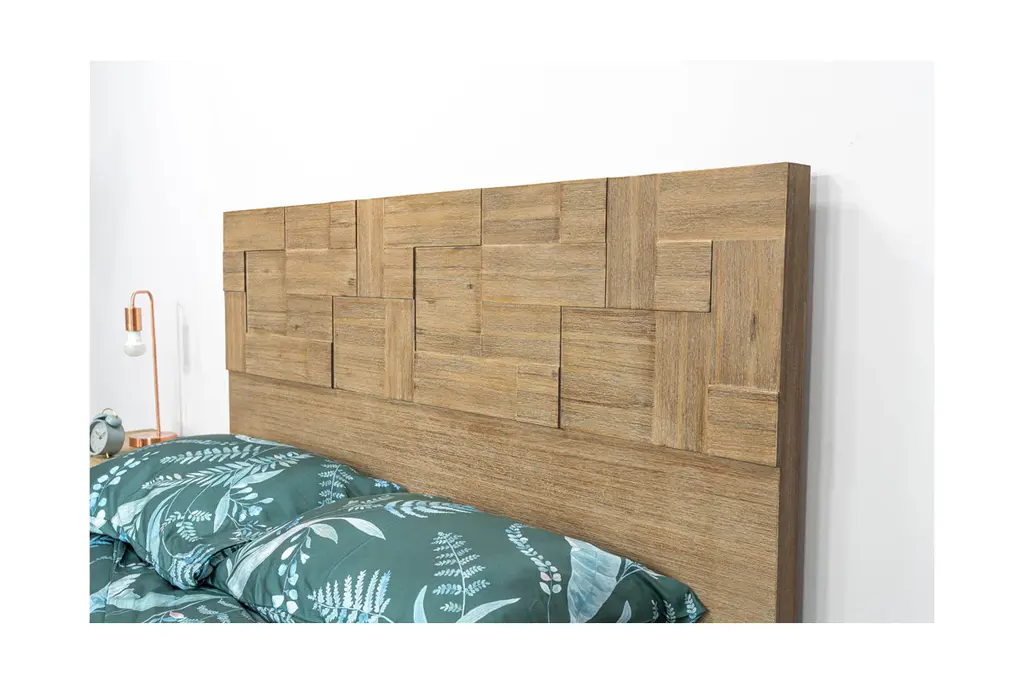 The Panama Bed showcases a striking contemporary design crafted from durable acacia wood, making it a standout modern bed frame for any bedroom. Its headboard features an eye-catching geometric tile pattern that complements the clean, rectangular lines of the frame. The natural wood grain finish highlights the richness of the acacia wood, adding warmth and texture to your space. Designed with a sturdy slatted base, this bed provides excellent mattress support without the need for a box spring, combining style and functionality effortlessly. Perfect for those seeking a sleek yet inviting centerpiece for their modern bedroom decor.