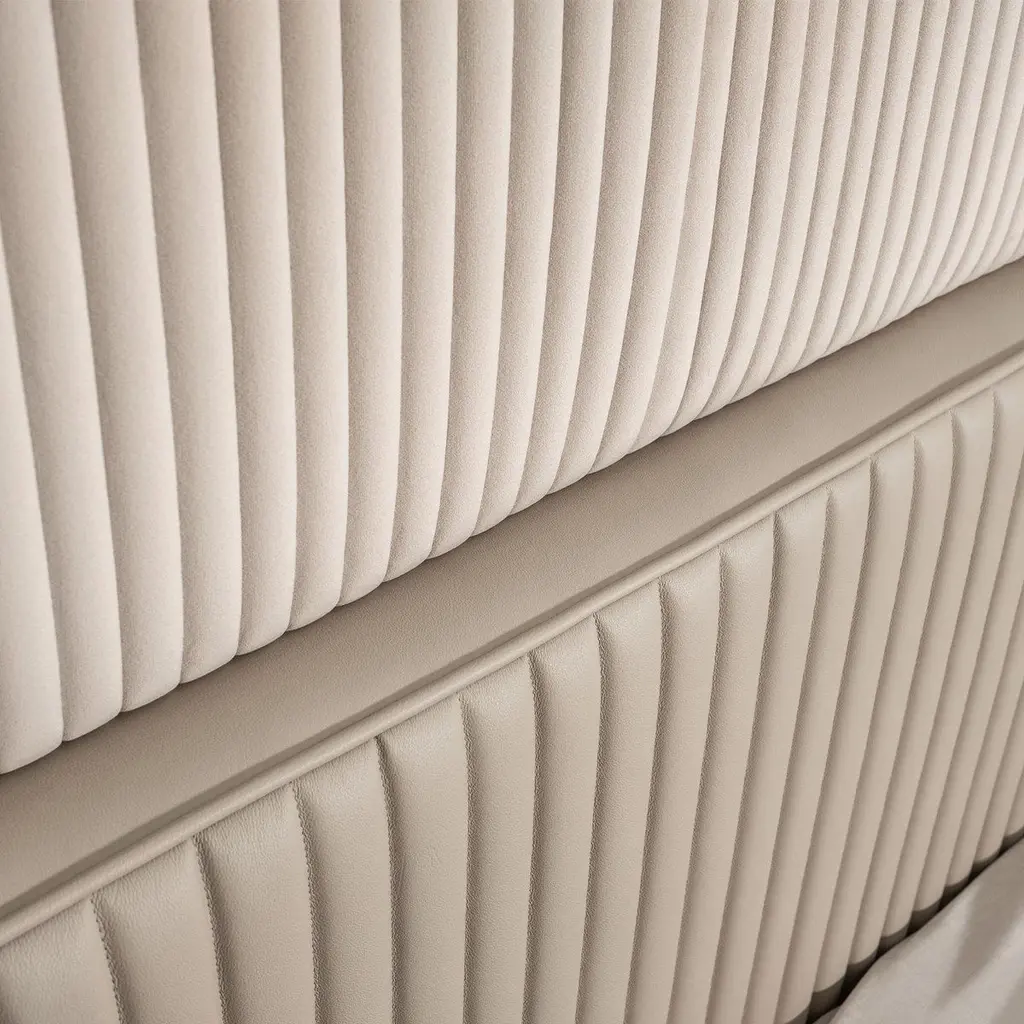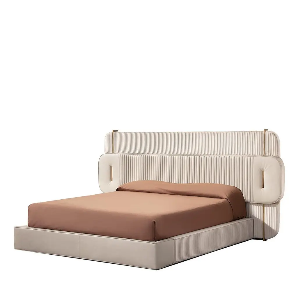 A stunningly clean-lined piece of functional decor, this extraordinary bed will enliven any luxe contemporary interior. Made of wood upholstered with first-rate cream white leather, it features a large headboard enhanced with satin brass-finished metal inserts and fine pipe stitching. Softly padded, it is equipped with a 180 x 200cm mattress. Please consult the Concierge for further details and customization options.