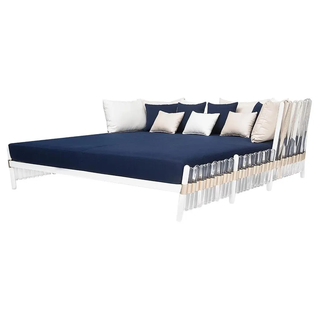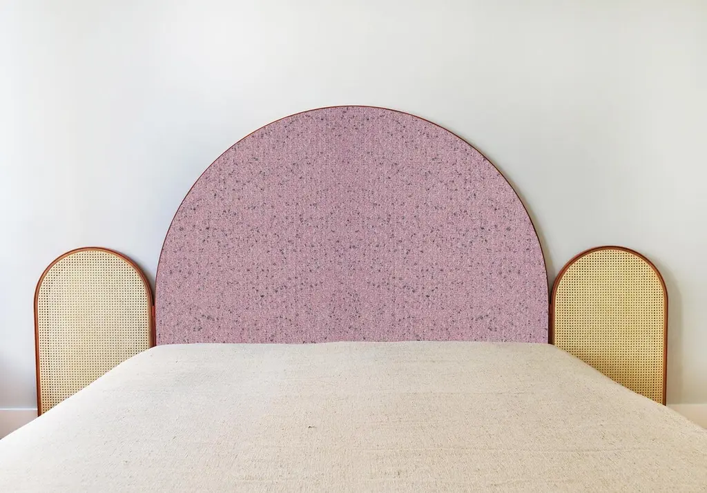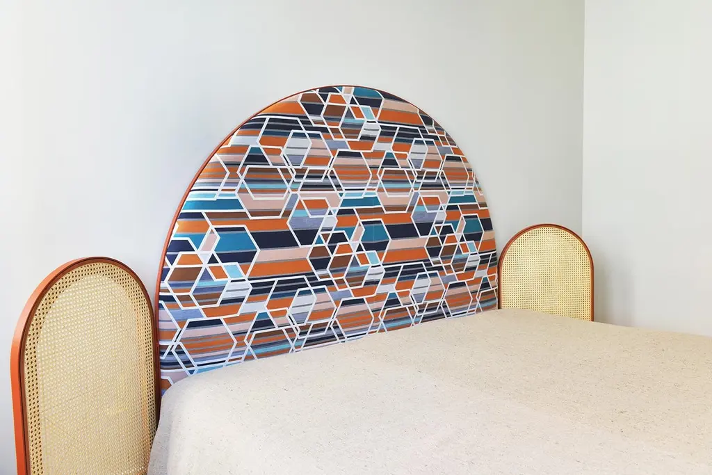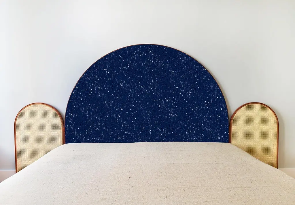 “Paravent Ideal” is a handcrafted, screen headboard made by artisans in Turkey, preserving and sustaining traditional Turkish handcrafts. The central large arc is upholstered in Dedar fabric Fandango, which comes in blue, yellow and purple colors. The caned side panels flanking the central can be adjusted to create different effects of light reflection and enclosure. “Paravent Ideal” is made to order and can be produced in most sizes including King, California King, Queen, Full and Twin sized beds.