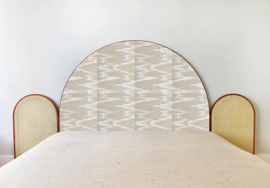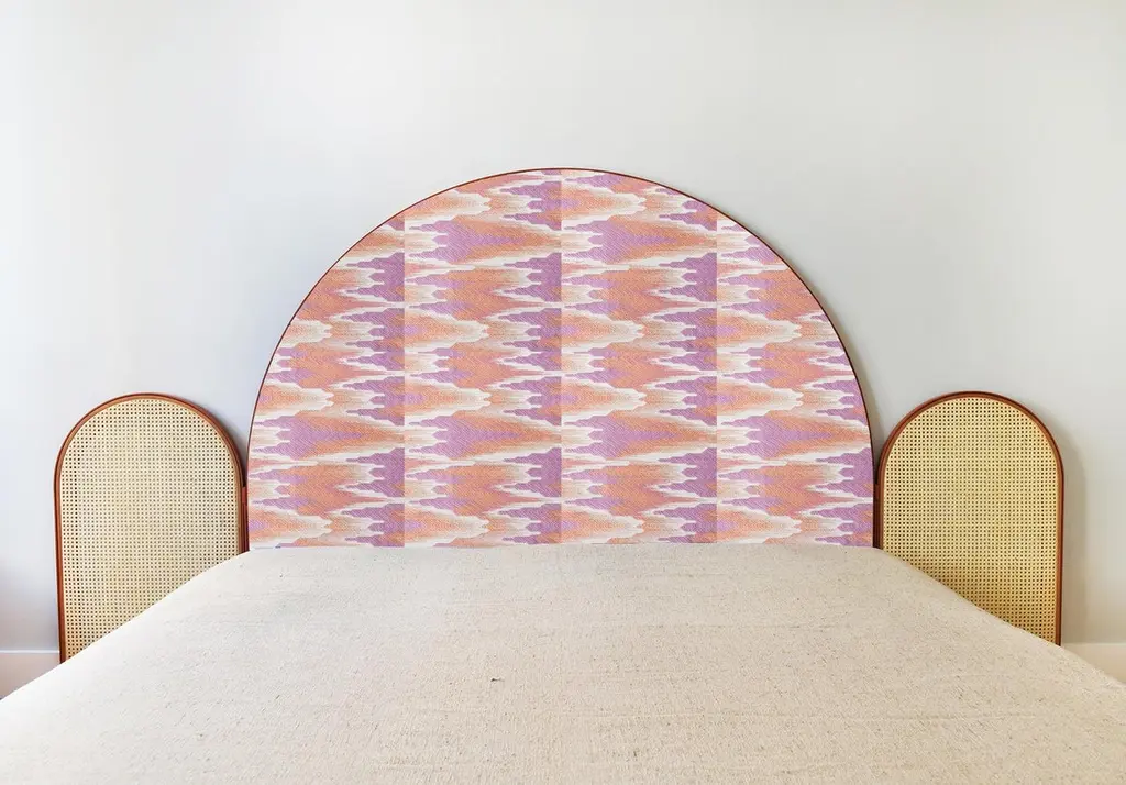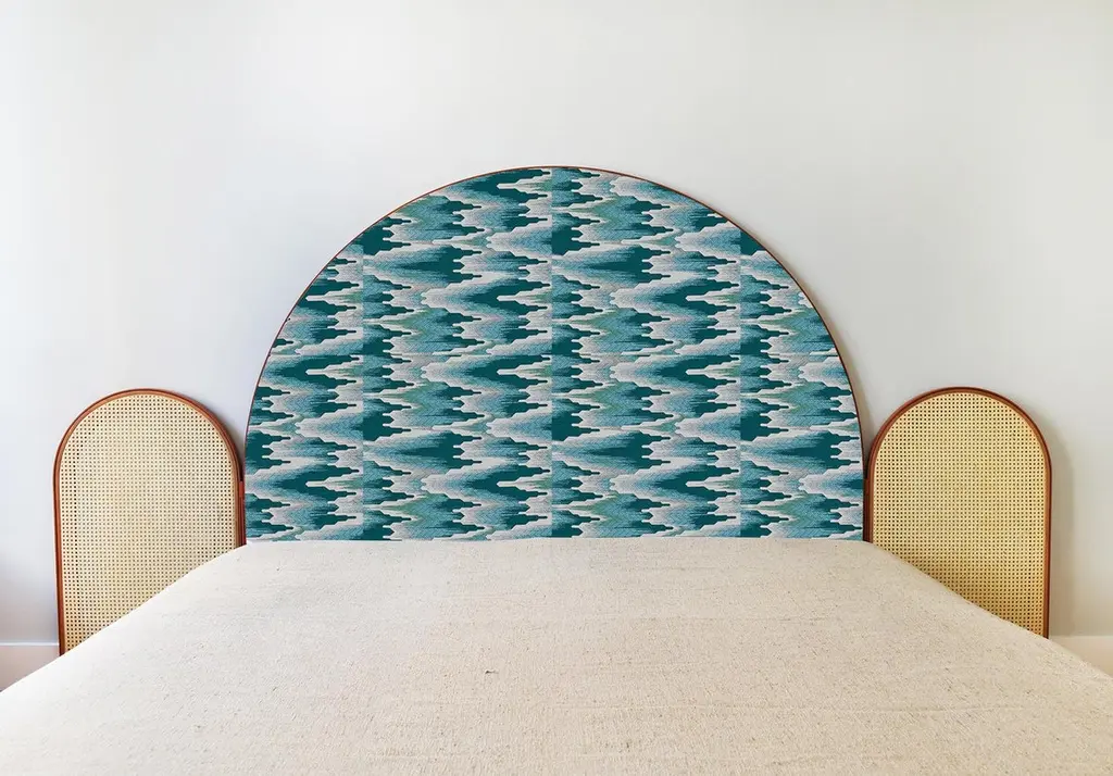 “Paravent Ideal” is a handcrafted, screen headboard made by artisans in Turkey, preserving and sustaining traditional Turkish handcrafts. The central large arc is upholstered in Dedar fabric Fandango, which comes in blue, yellow and purple colors. The caned side panels flanking the central can be adjusted to create different effects of light reflection and enclosure. “Paravent Ideal” is made to order and can be produced in most sizes including King, California King, Queen, Full and Twin sized beds.