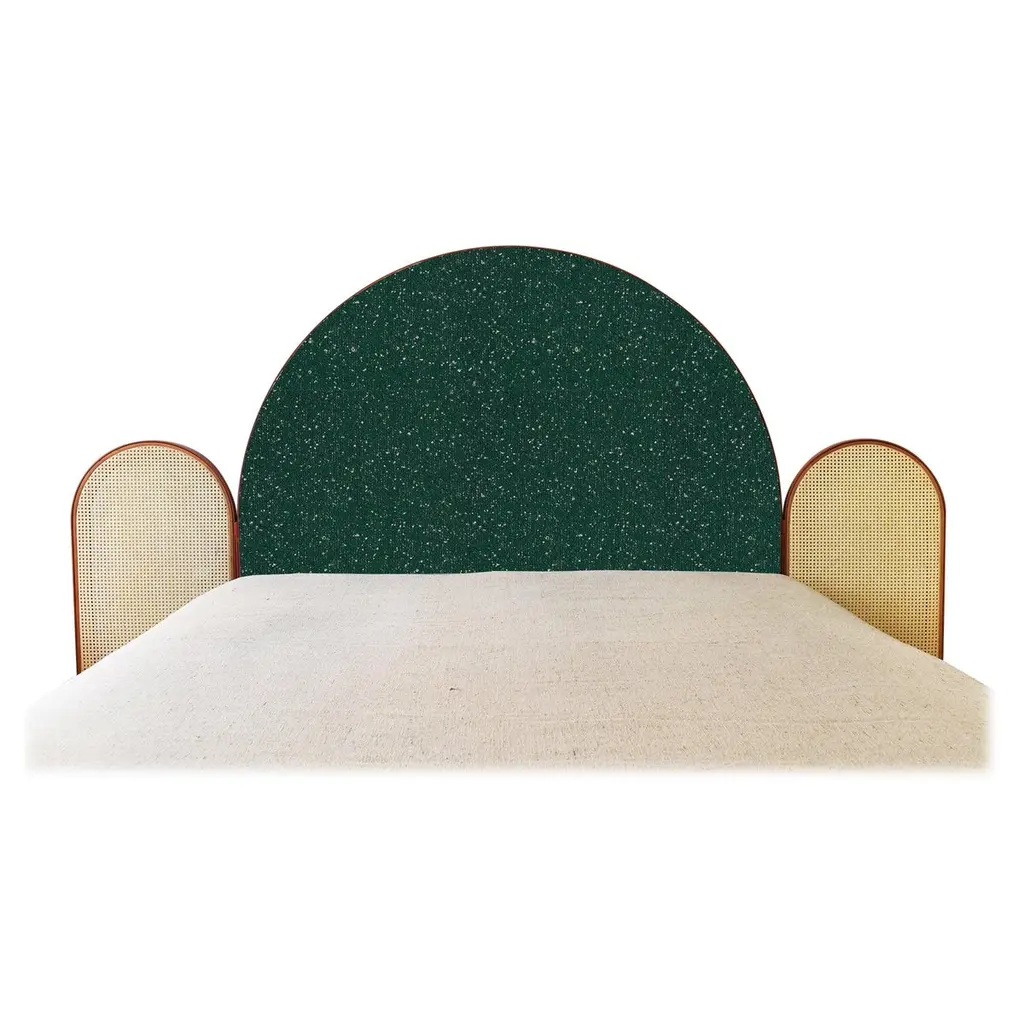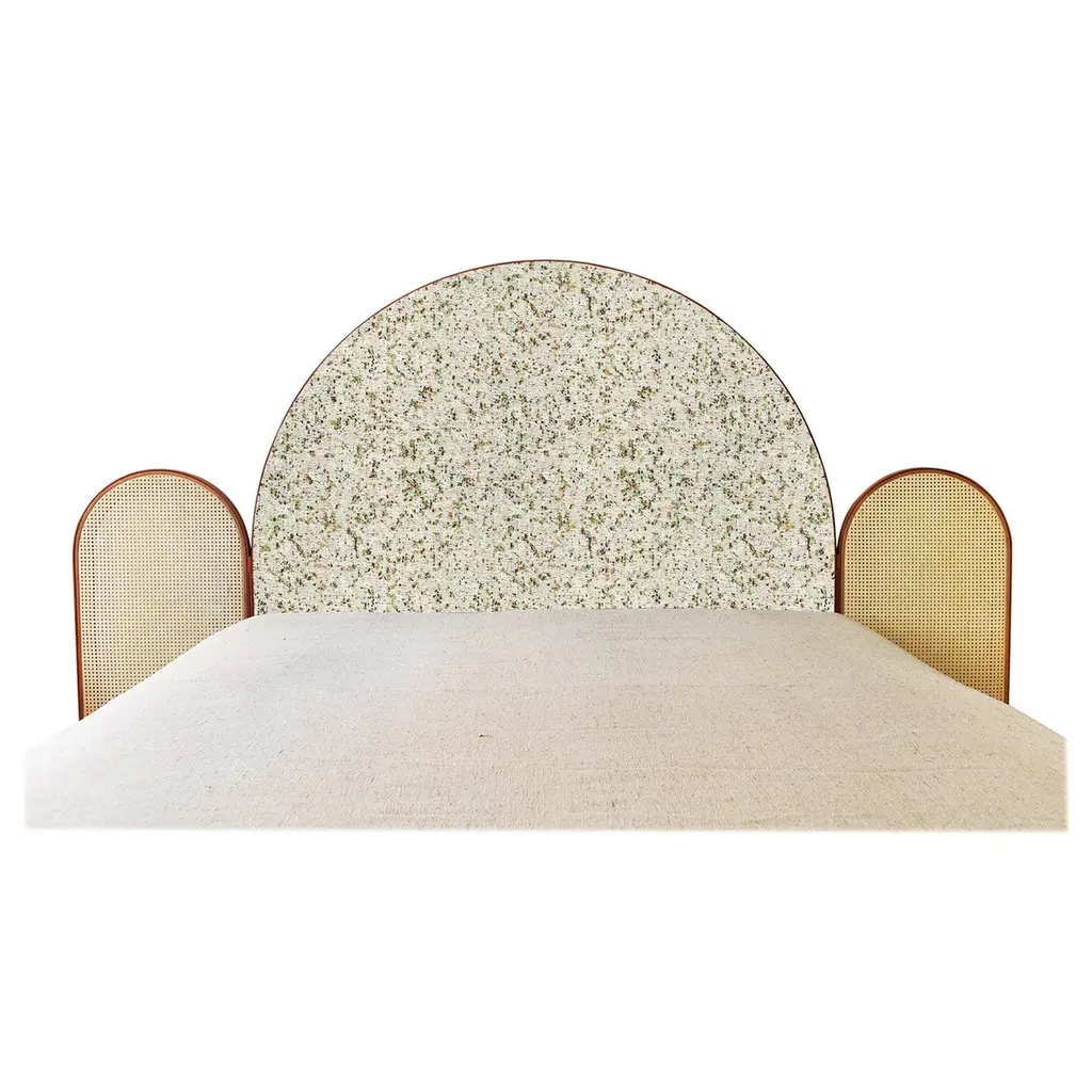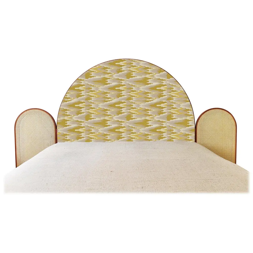 “Paravent Ideal” is a handcrafted, screen headboard made by artisans in Turkey, preserving and sustaining traditional Turkish handcrafts. The central large arc is upholstered in Maharam geometric fabric Agency, which has hues of burnt orange, blues and nude. The caned side panels flanking the central can be adjusted to create different effects of light reflection and enclosure. “Paravent Ideal” is made to order and can be produced in most sizes including King, California King, Queen, Full and Twin sized beds.