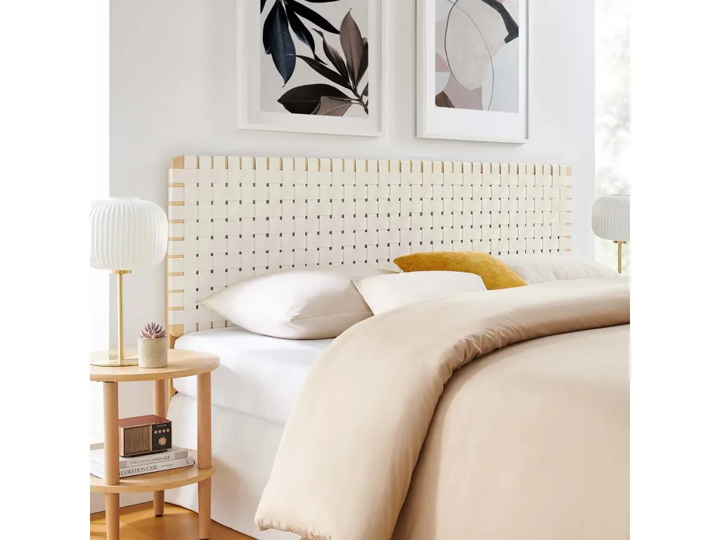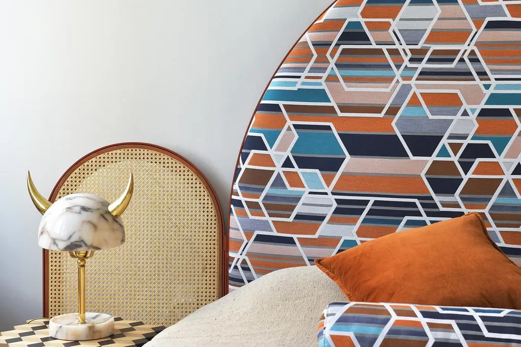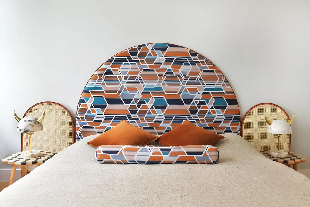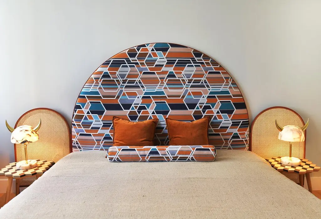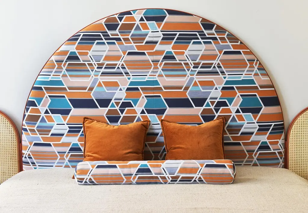 “Paravent Ideal” is a handcrafted, screen headboard made by artisans in Turkey, preserving and sustaining traditional Turkish handcrafts. The central large arc is upholstered in Maharam geometric fabric Agency, which has hues of burnt orange, blues and nude. The caned side panels flanking the central can be adjusted to create different effects of light reflection and enclosure. “Paravent Ideal” is made to order and can be produced in most sizes including King, California King, Queen, Full and Twin sized beds.