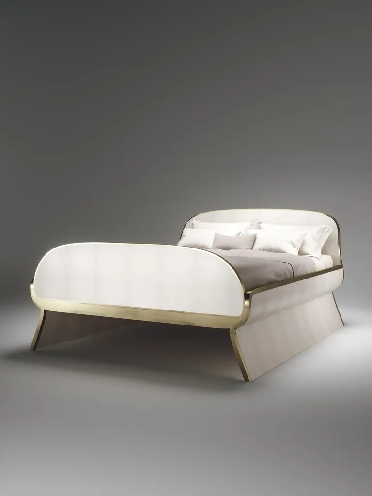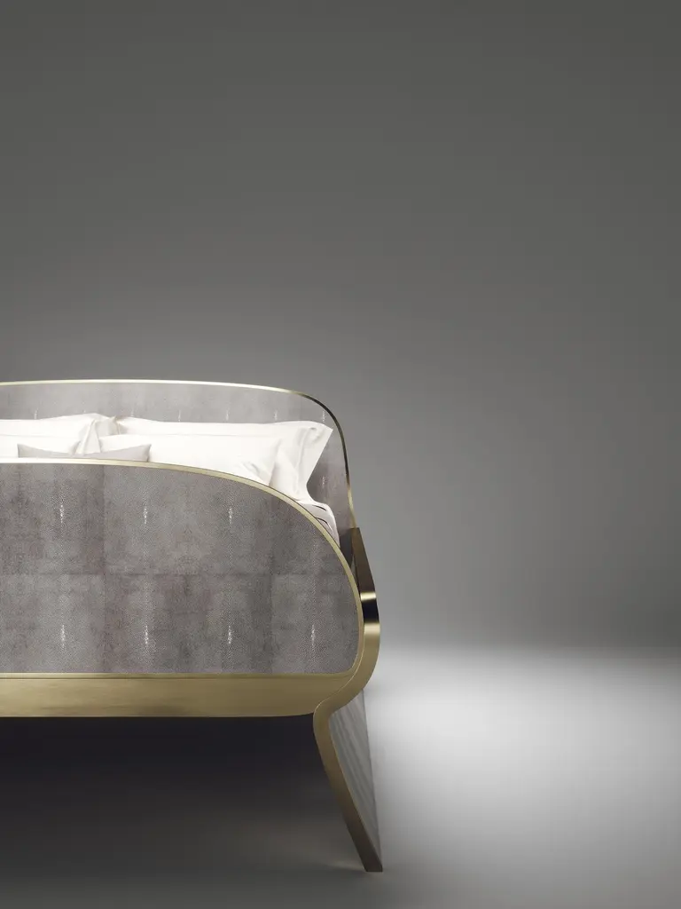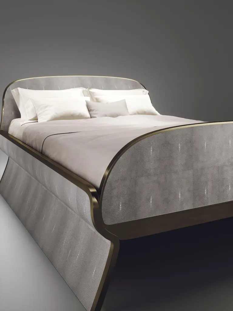 The Paris based label has distinguished themselves since their launch, with their iconic use of shagreen mixed with brass and other exotic materials. All furniture is handcrafted by skilled artisans, ultimately making each piece unique, designed in Paris and produced in the Philippines.The Dandy bed inlaid in cream parchment and bronze-patina brass is a one of a kind piece. This modern and elegant design creates a subtle and sculptural statement for any bedroom. This design comes in other finishes as shown in the image slides. The frame is sold without the mattress. Custom sizing available to suit any bed sizing. This piece is designed by Kifu Augousti, the daughter of Ria and Yiouri Augousti. The dimensions of this piece are 170 x 232.9 x 103.2 cm All Kifu Paris pieces are handmade by artisans, ultimately making each piece unique. Custom color/sizing available on request. Wipe clean with soft dry cloth.Although inspired by her parents, her collection of Home Accessories and Furniture is a distinct identity of its own. Kifu uses handmade techniques of elaborate inlay patterns of shagreen, shells, semi-precious stones, materials she experienced as a child growing up in her parent’s studio, but interpreted in a younger quirkier way reflecting her youth. From her "jewelry inspired knobs" on decorative boxes, gold bar boxes and an extravagant inlay pattern mix of shagreen and shell inspired by galactic constellations, as seen on her enormous round mirror, is refreshing to see. Kifu embodies whimsical elements throughout her collection and is not afraid to be daring and unexpected in her approach to design. All shagreen-covered items should be kept out of direct sunlight, color variants may occur on the stingray and other exotic finishes, but this showcases the Parisian label's commitment to creating authentic luxurious products using natural components.