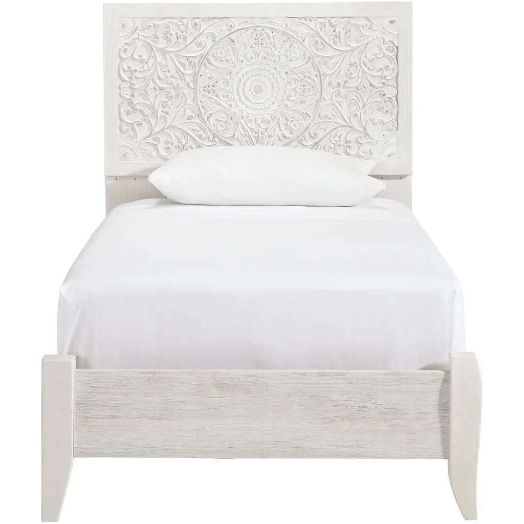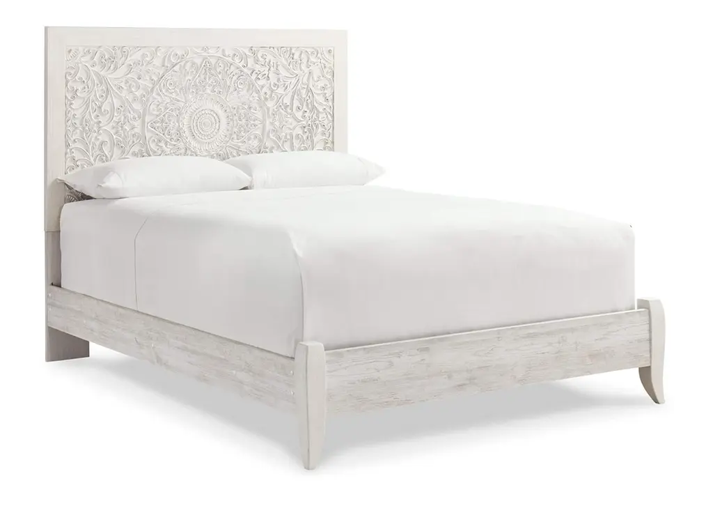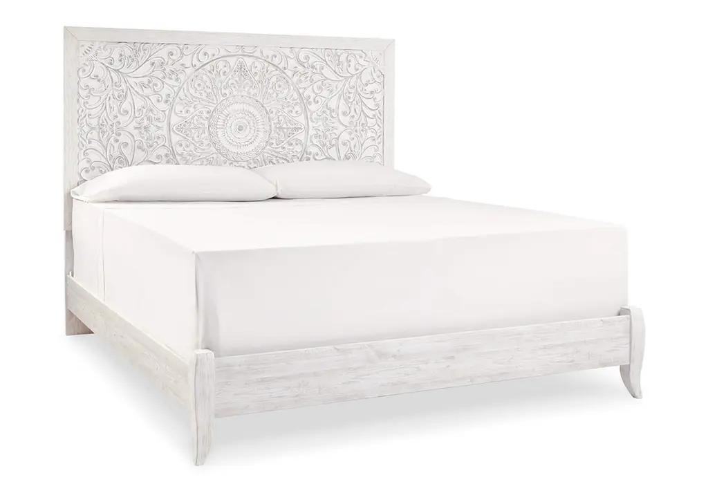 The Paxberry bed brings the spirit of boho chic into the bedroom. This carved medallion pattern on the headboard is intricate yet easygoing, with a timeless sensibility that never goes out of style. And the whitewash finish has a casual, hand-applied look. This panel bed makes a great focal point for the Paxberry collection, or your own cottage-style furnishings. Made of engineered wood and veneers, it adjusts to your choice of four heights.