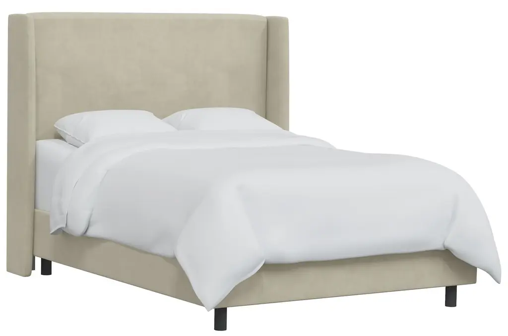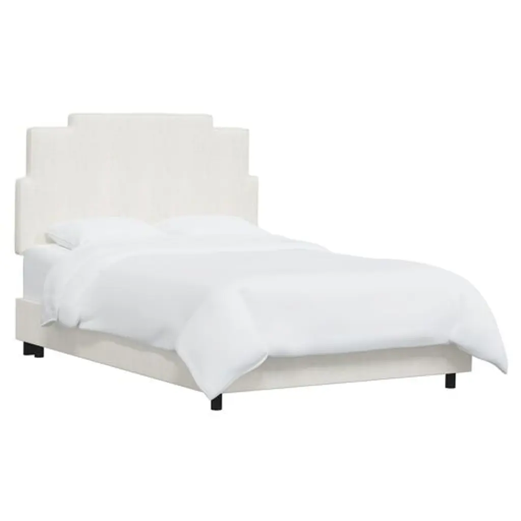 Designed by us and available only at One Kings Lane: The stepped silhouette of this neutral panel bed dresses the room with instant drama and sophistication. And because it's upholstered in amply padded linen-blend fabric and anchored to a pine-and-metal frame, it offers soft, sturdy support for reading and watching TV in bed. Mattress and box spring required. Made in the USA.
