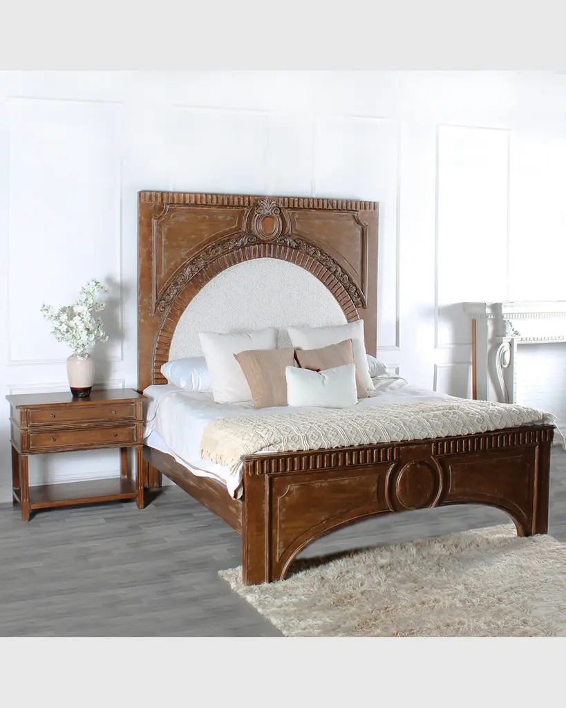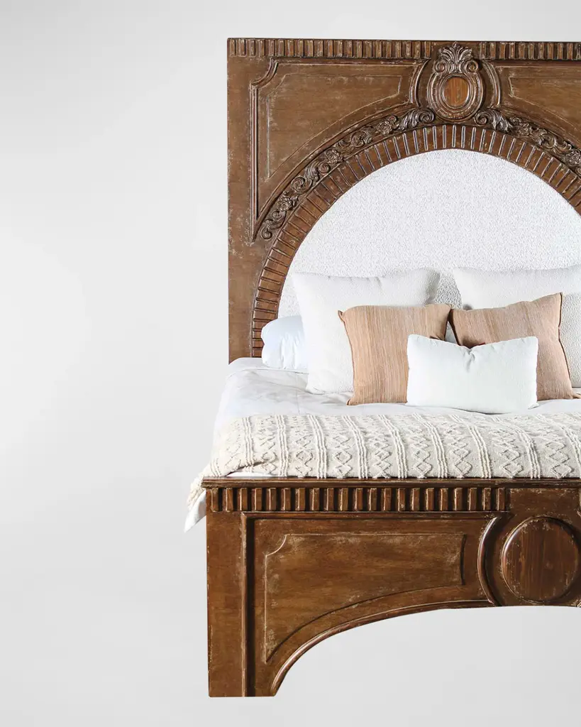 The Amelie King Bed is a classic design with architectural details throughout that are softened by an upholstered headboard to add comfort. A center hand-carved medallion is paired with an arch design with hand-carved scrolls. Handcrafted of oak wood and polyester Slat system Overall, approx. 83"W x 90"D x 88"T Assembly required; includes hardware Wipe clean Weight, 250.0 lbs Made in Peru Boxed weight, approximately 300.0 lbs Shipping Direct from Vendor, usually ships within 60 business days. About Peninsula Home Collection: In 1996, Peninsula Home Collection established itself as the leading brand of home furnishings manufactured in Peru and Southern California. Argentina born and raised, Gonzalo and Federico Alonso founded PHC in response to their deeply rooted interest in classic design and architecture. The Alonso brothers were exposed to historically authentic family treasures, elegant aesthetics, and quality craftsmanship. For 25 years, PHC has curated a team of highly skilled, native craftsmen to produce elegant products. In-house product development and manufacturing allows for control of every segment of the manufacturing while offering us the ability to widen our creative capacity and design products that are stylized for quality rather than quantity.