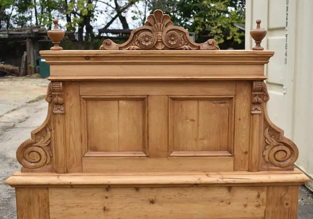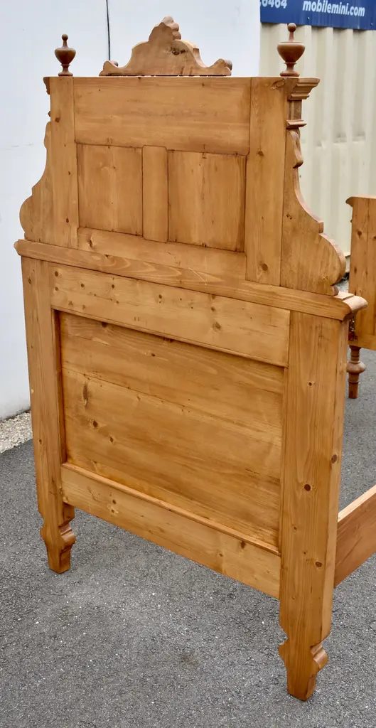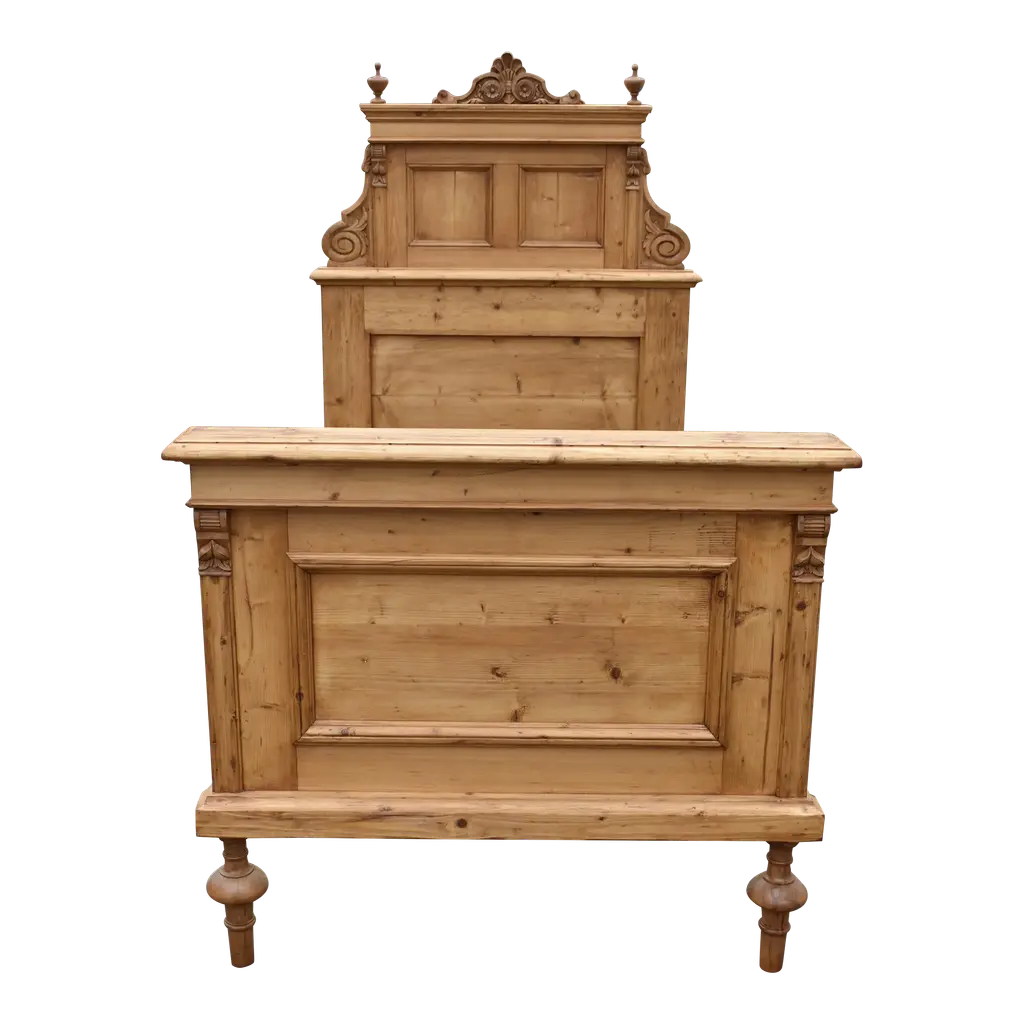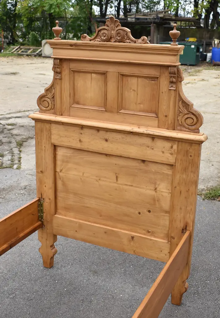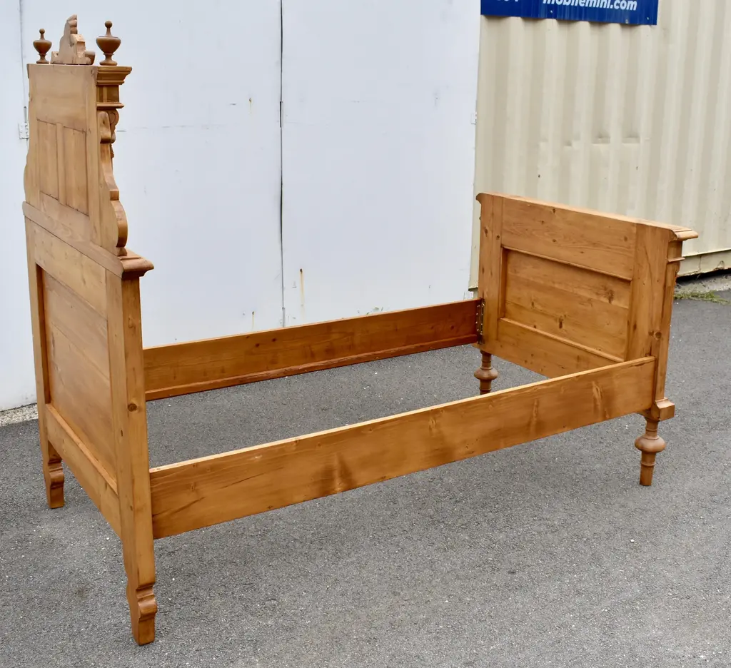 This majestic Art Nouveau box bed would be a stately presence in any child’s bedroom. The headboard is built in two pieces. The lower part consists of a flat panel, framed with thick rails and stiles. The upper part has a bold crown molding bearing two turned hardwood finials and a carved crest.. Beneath, two flat panels are flanked by boldly fluted columns with carved fruit corbels. On each side is a shapely buttress with carved spirals and leaves. The footboard has a single flat panel in a sturdy frame with the flutes and corbels as on the headboard. The sides are straight and the interior dimensions are approximately 71”x 36”, so a custom-sized mattress is required. This bed is one of a matched pair with 26VJL77b.