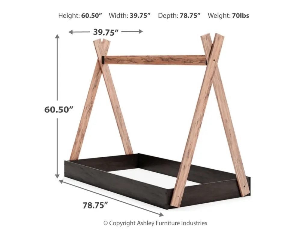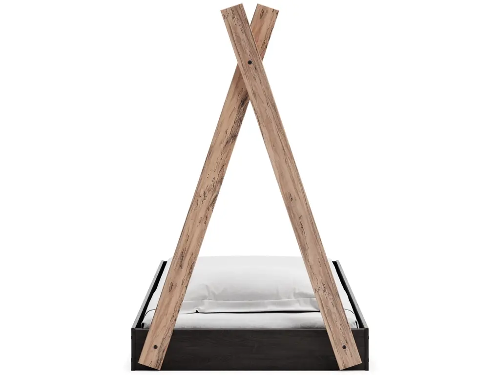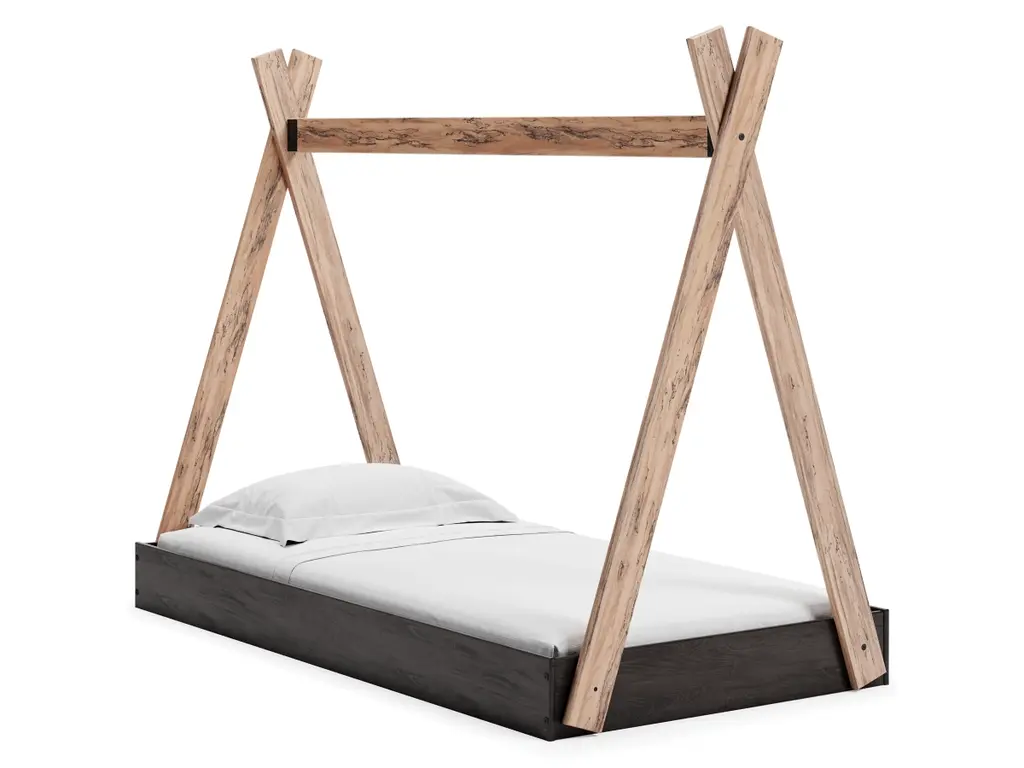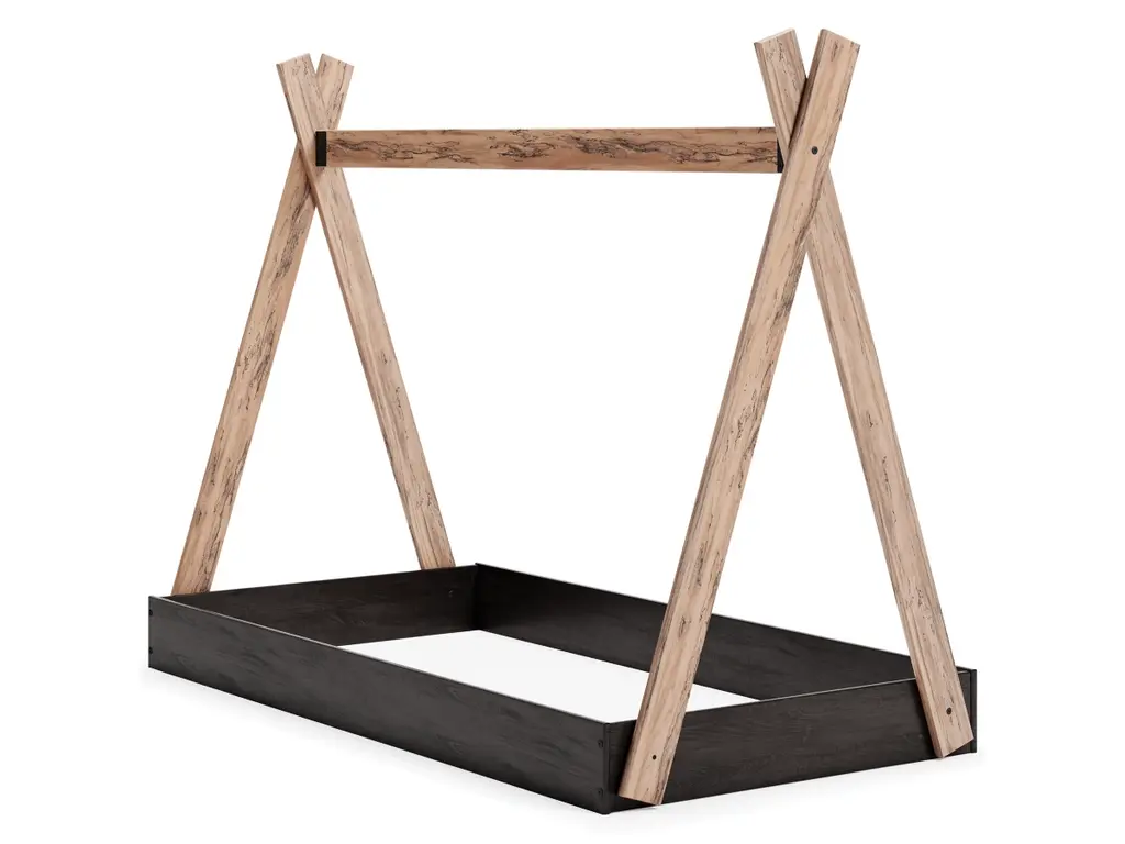 Adventure awaits with the Piperton twin tent complete bed in a box. An effortless blend of contemporary and casual style, it features an expressive two-tone look, with a dark charcoal finish over replicated oak grain with an authentic touch and a replicated sugarberry wood grain. This complete bed in a box requires no additional foundation, making it a functional yet unique addition to your home.