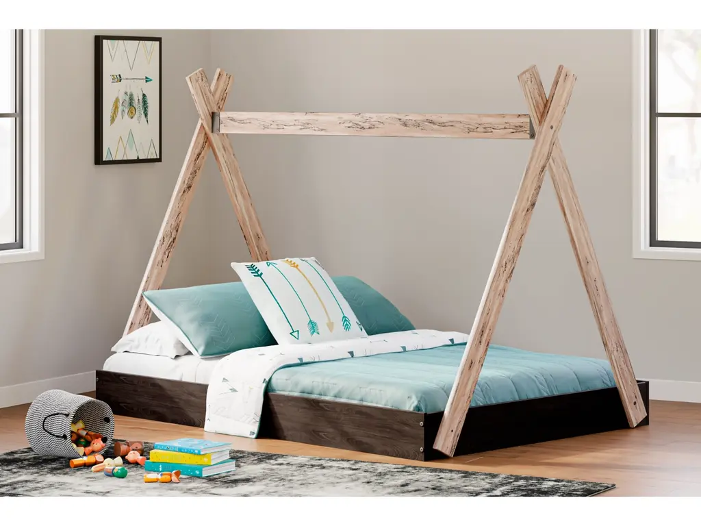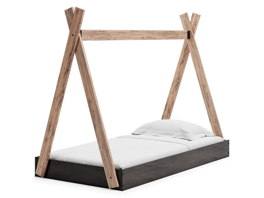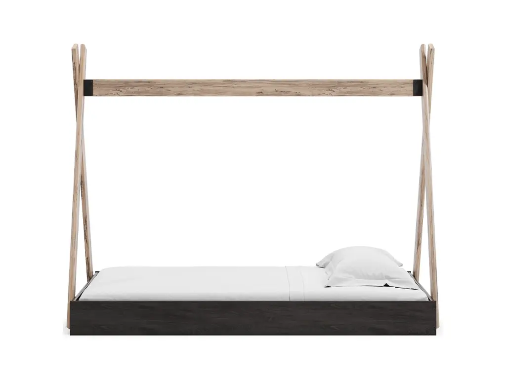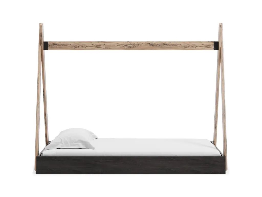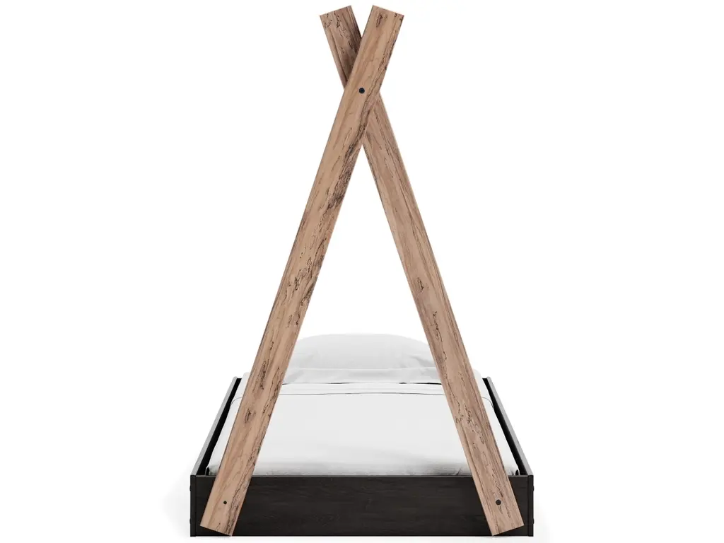 Adventure awaits with the Piperton twin tent complete bed in a box. An effortless blend of contemporary and casual style, it features an expressive two-tone look, with a dark charcoal finish over replicated oak grain with an authentic touch and a replicated sugarberry wood grain. This complete bed in a box requires no additional foundation, making it a functional yet unique addition to your home.