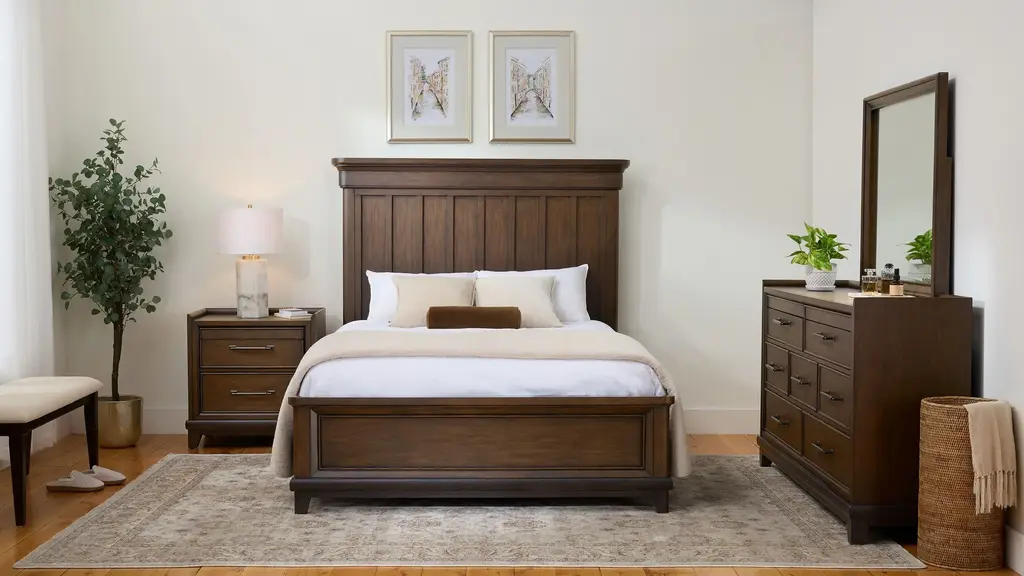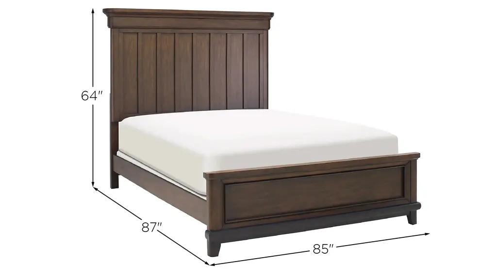 Mission style elements and architectural details give the Prospect Park king bed a stately charm thats bound to make it an heirloom of tomorrow. Carefully crafted with framed panels, raised molding, and a rich oak, cathedral grain finish, this platform bed has a commanding presence with a majestic, tall headboard.