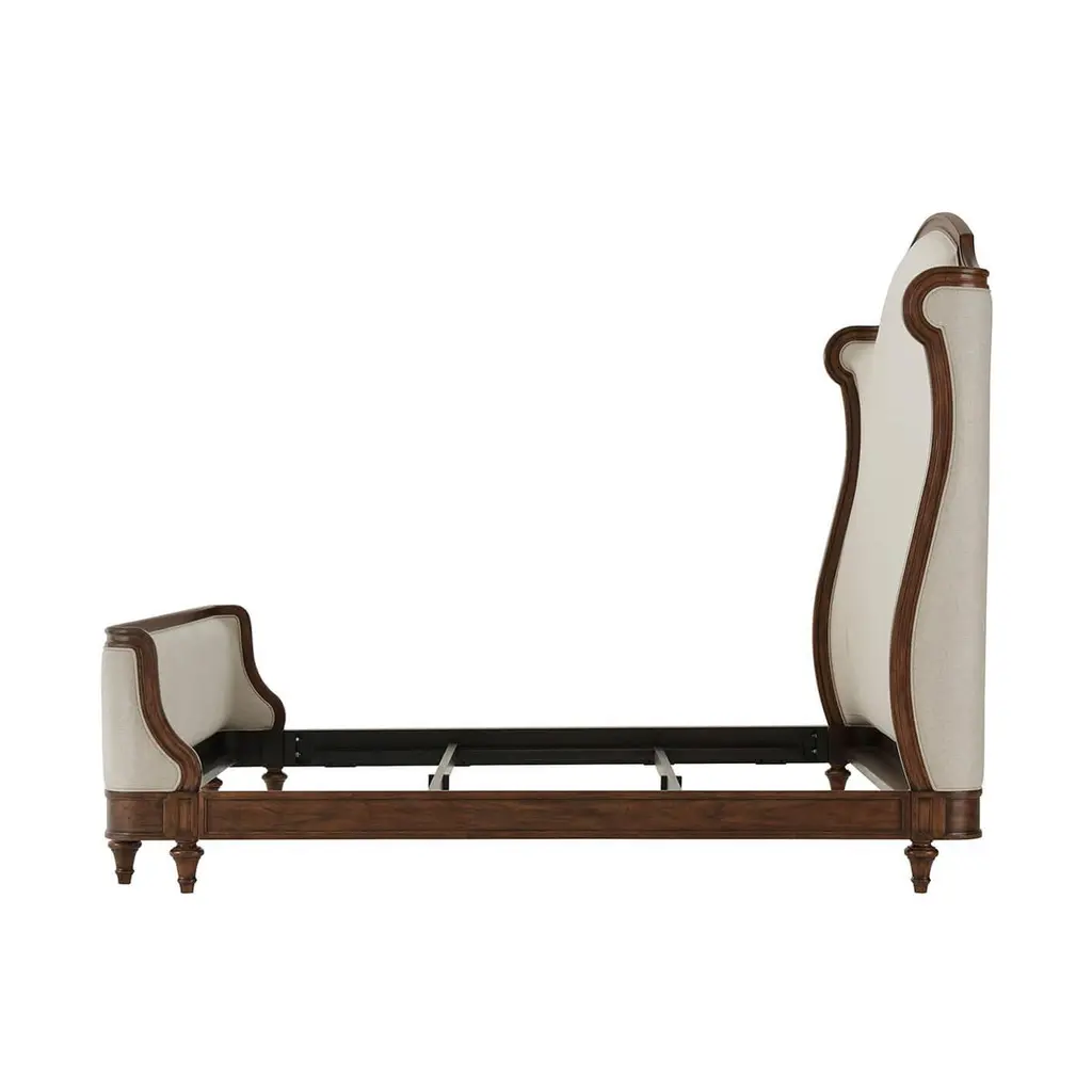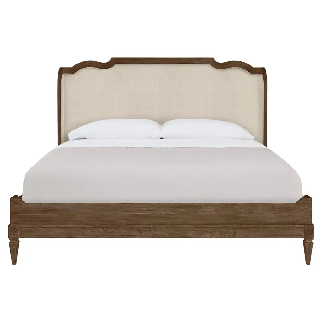 A French Provincial carved king size bed with an arched and molded upholstered headboard with scroll wings, an upholstered and hand-carved framed low footboard and paneled rails on turned and tapered taupee feet. Dimensions: 81.75" W x 86.75" D x 70" HLinen FabricFor US King mattress - 76 x 80".