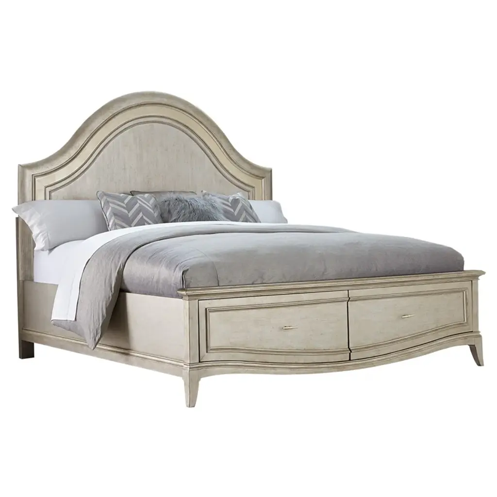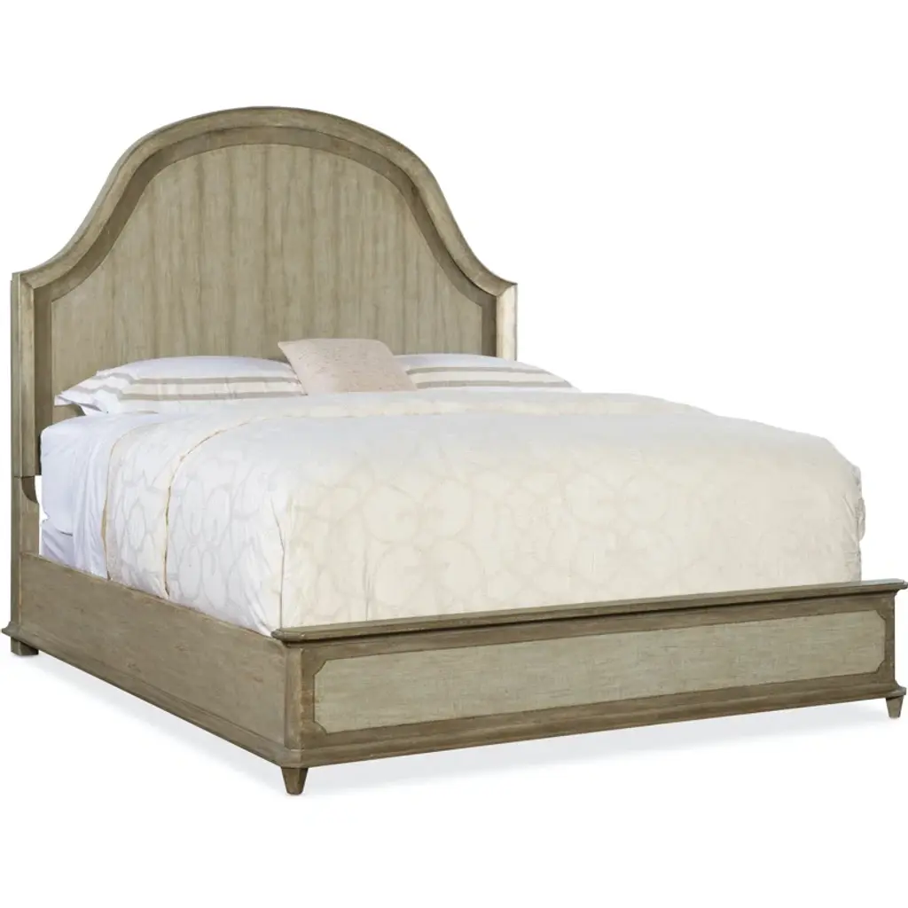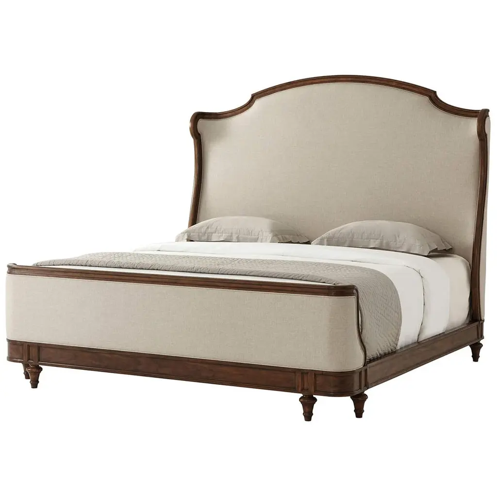 A French Provincial carved and painted king size bed with an arched and molded upholstered headboard with scroll wings, an upholstered and hand carved framed low footboard and paneled rails on turned and tapered taupee feet. Dimensions: 81.75" W x 86.75" D x 70" HDraper linen fabricFor US king mattress - 76 x 80".