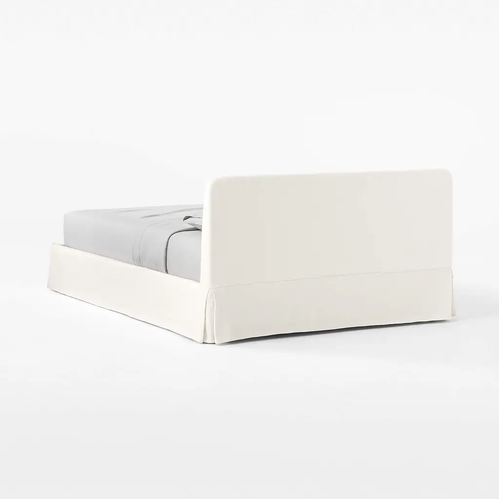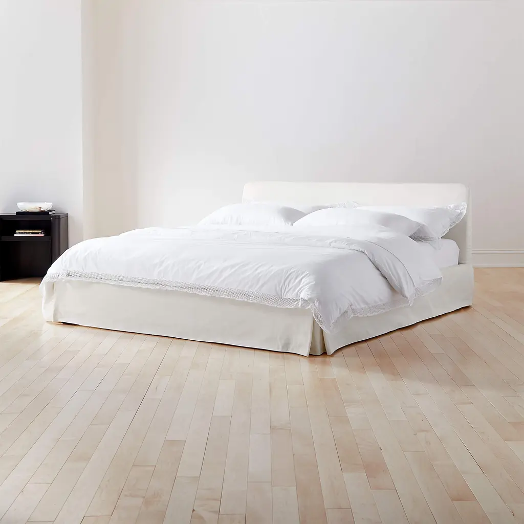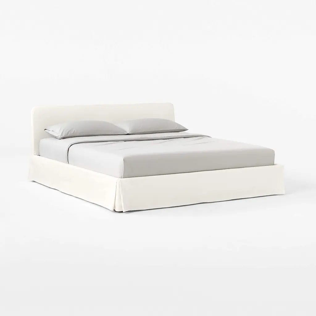 Beauty is in the details of this ivory king bed by Kara Mann. One slipcover fits over the entire frame, draping it in luxe sateen. Perfectly tailored box pleats line the corners. "Even when something is simple, it's those little details that can make it feel so special," explains Kara. CB2 exclusive.