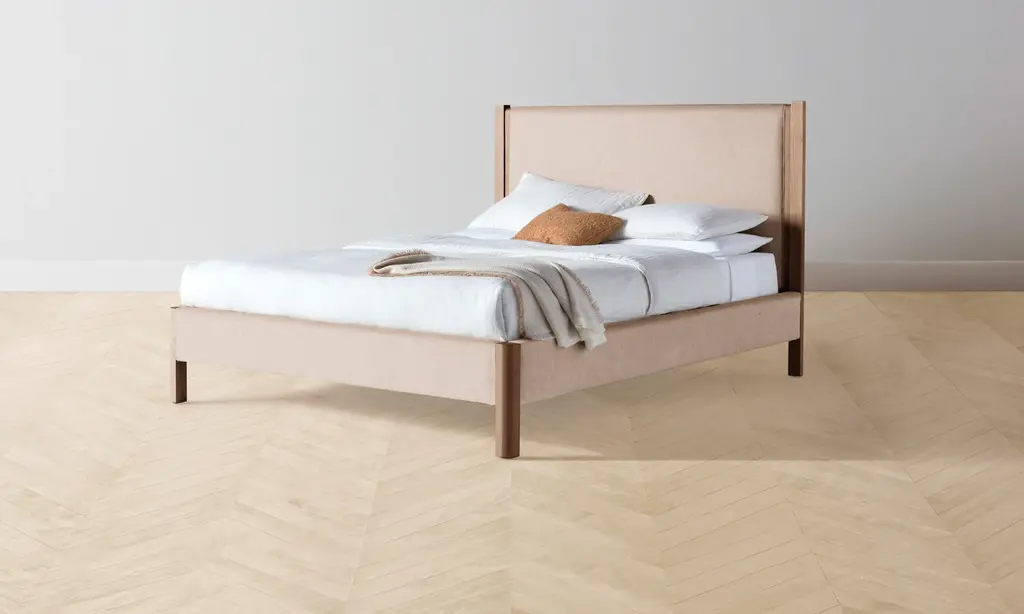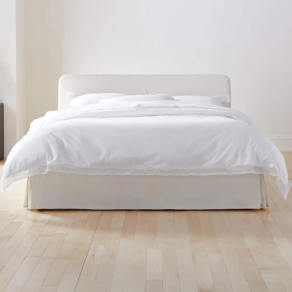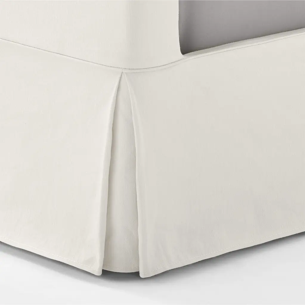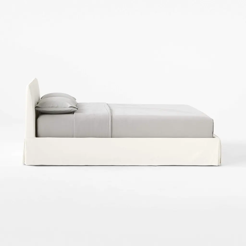 Beauty is in the details of this ivory king bed by Kara Mann. One slipcover fits over the entire frame, draping it in luxe sateen. Perfectly tailored box pleats line the corners. "Even when something is simple, it's those little details that can make it feel so special," explains Kara. CB2 exclusive.