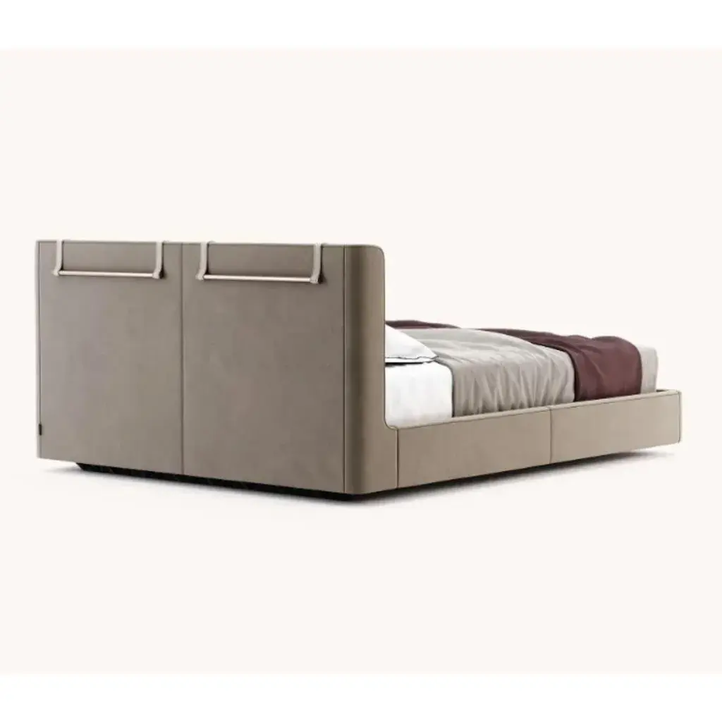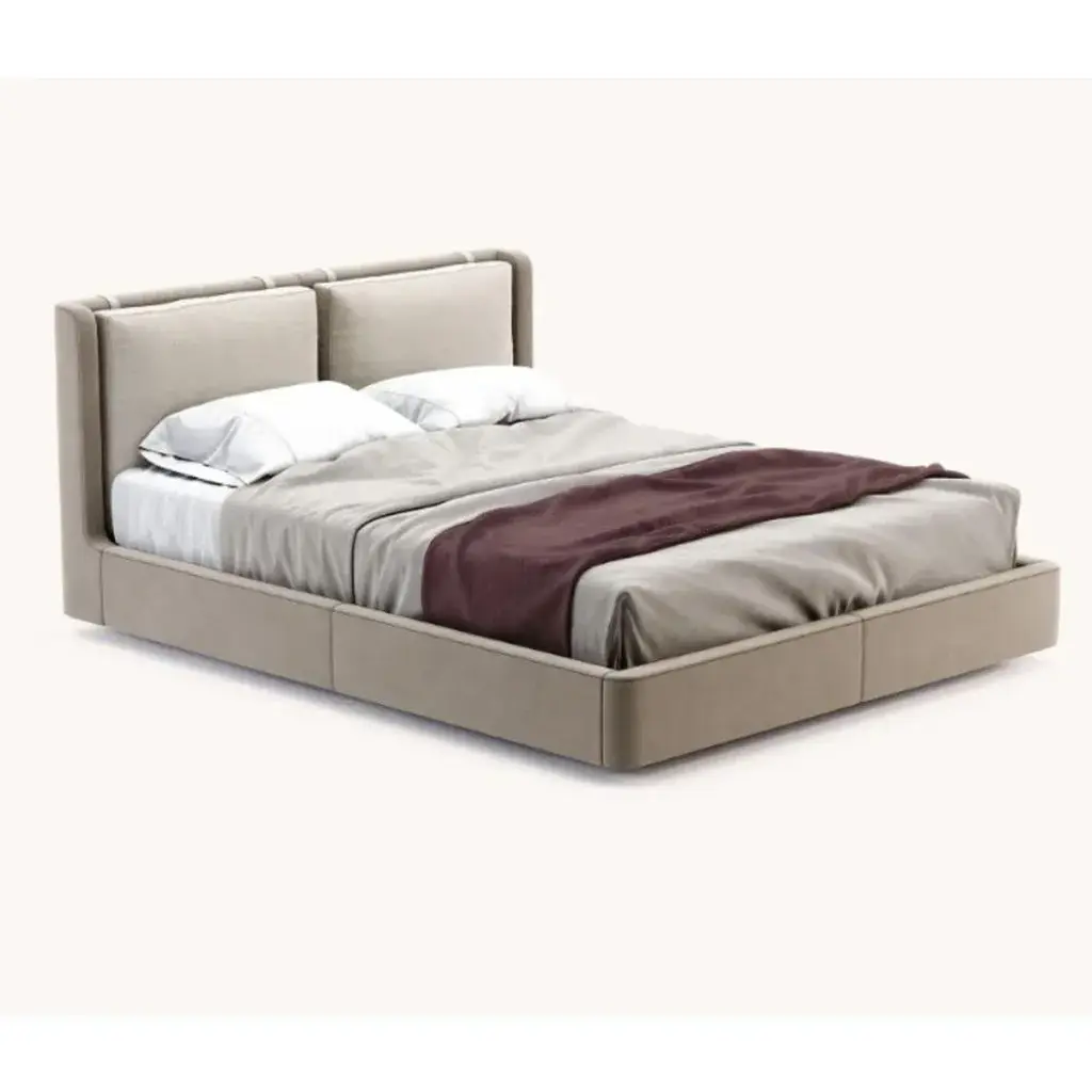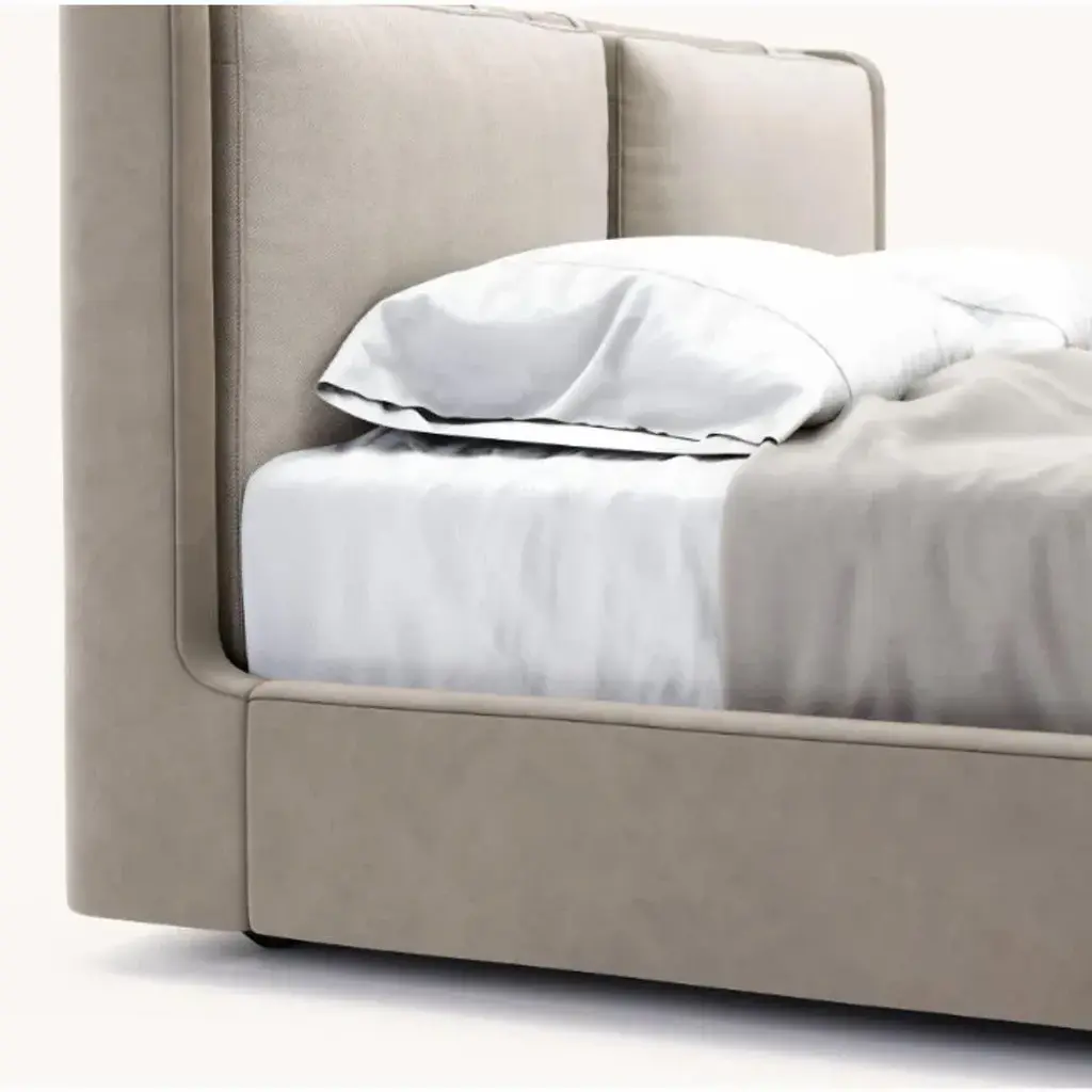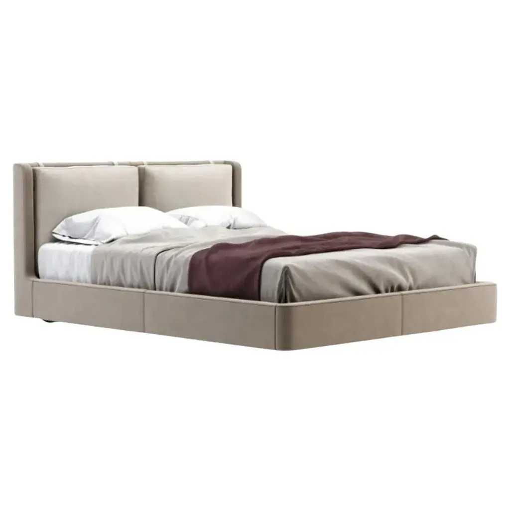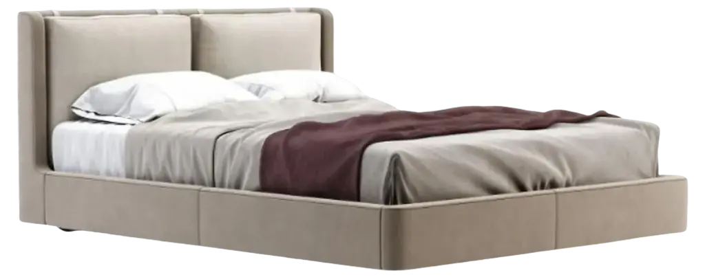 Queen Size Kelsi bed by Domkapa Dimensions: W 168 x D 231 x H 95 cm. Materials: Microfiber (Tarn 03), patterned fabric (Verdon 01), rose gold brushed. Also available in different materials. Kelsi is an outstanding design and handcraft work, combining unique production techniques and fine materials to create a rare piece. The wingback headboard is the focal point of this bed, rich in details. It features two large padded cushions for extreme comfort, supported by two lavish metallic tubes. Along with the structure, you can find other small details, the result of exclusive craftsmanship.