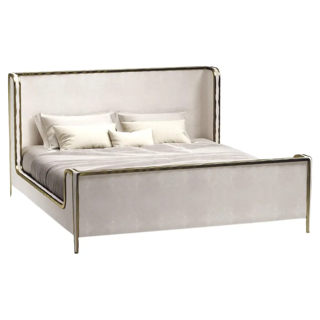 The Rays Bed offers a modern take on a classic style, upholstered in white and beige fabric. Its large rectangular headboard is characterized by a decorative button tufted design, whilst elegantly tapered legs add a refined touch. Exuding a romantic allure, this bed pairs beautifully with contemporary or cosmopolitan interiors. Bed slats, mattress and cushions are not included.