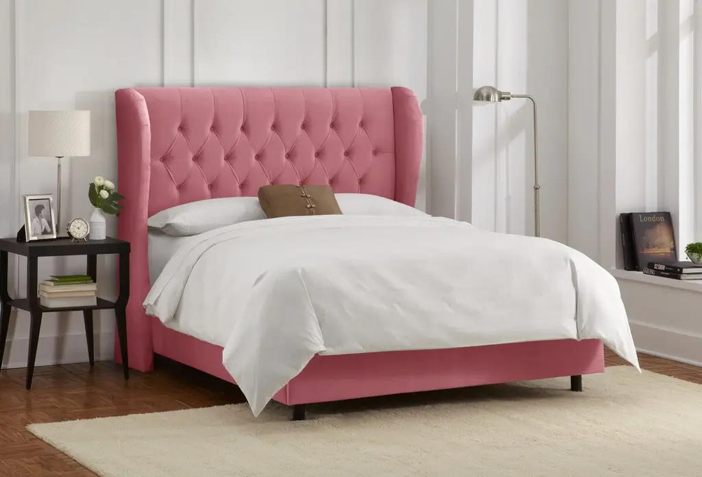 This handcrafted bed will ensure that your bedroom truly is a sanctuary. Diamond tufts accentuate the velvety plushness of the upholstery, while the dramatic height and wings add to the aura of luxury. This piece is part of a collection made from only the finest materials, featuring impressive craftsmanship and impeccable attention to detail. Mattress and box spring required. Handcrafted in the USA.