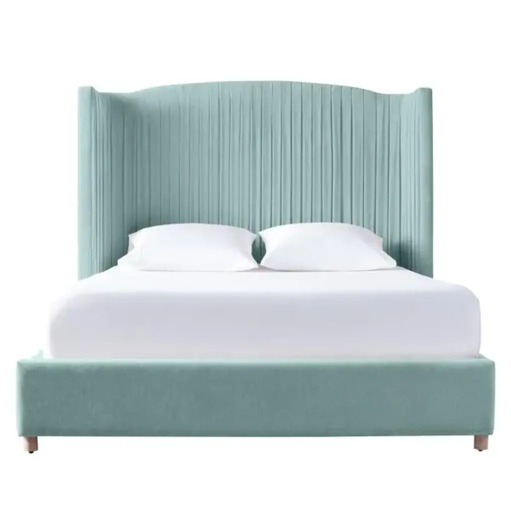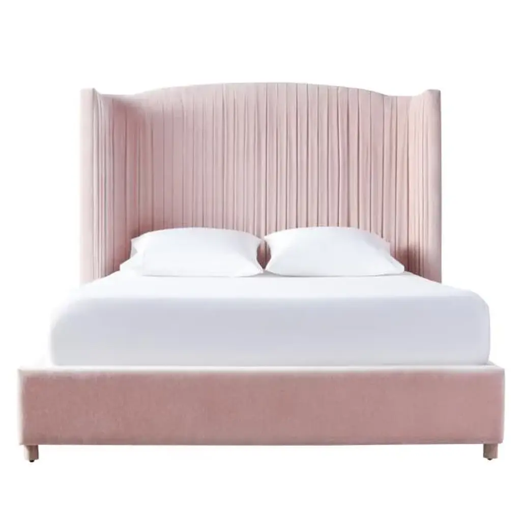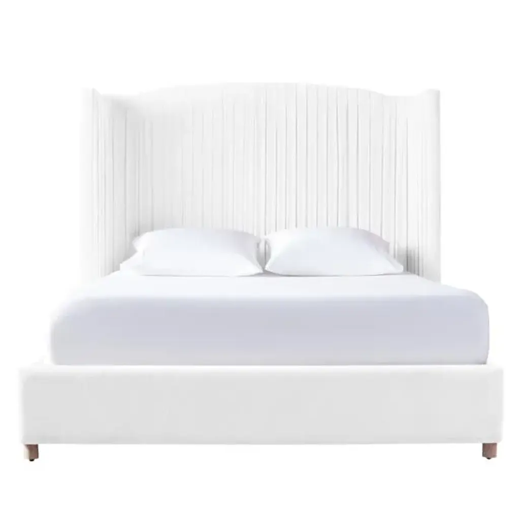 With its lavishly button-tufted headboard and lush linen-blend upholstery, this wingback bed will add instant glamour to any bedroom. Requires a mattress and a box spring. Handcrafted in the USA.