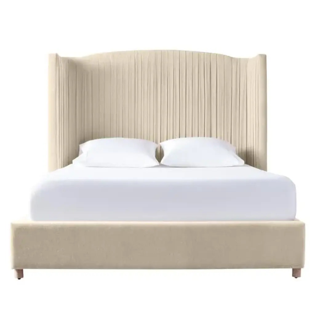 With its lavishly button-tufted headboard and lush linen-blend upholstery, this wingback bed will add instant glamour to any bedroom. Requires a mattress and a box spring. Handcrafted in the USA.