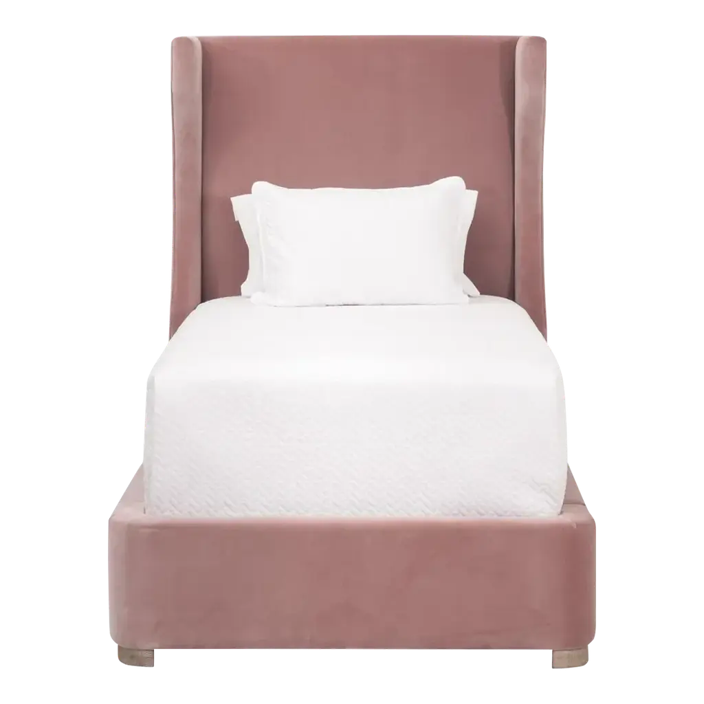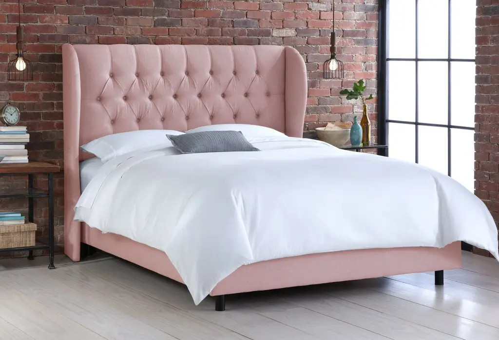 With its lavishly button-tufted headboard and lush linen-blend upholstery, this wingback bed will add instant glamour to any bedroom. Requires a mattress and a box spring. Handcrafted in the USA.
