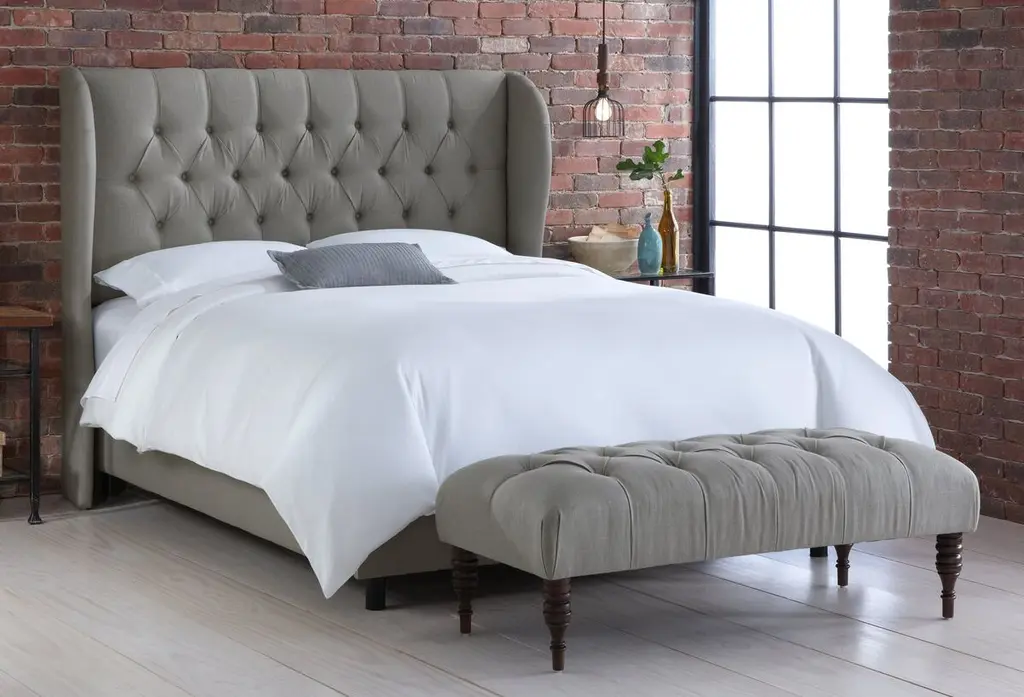 With its lavishly button-tufted headboard and lush linen-blend upholstery, this wingback bed will add instant glamour to any bedroom. Requires a mattress and a box spring. Handcrafted in the USA.