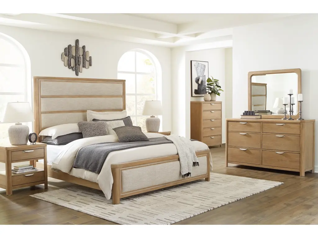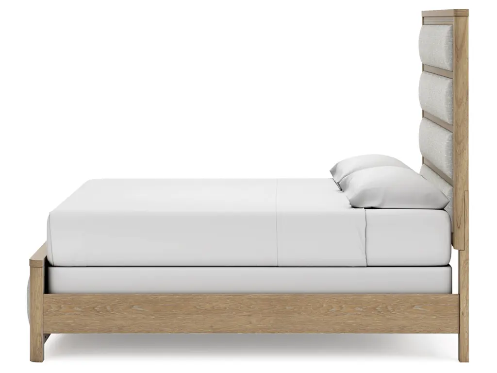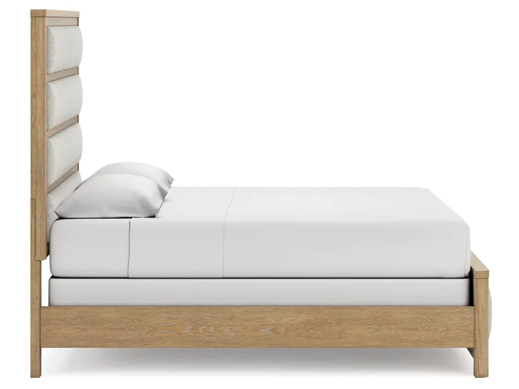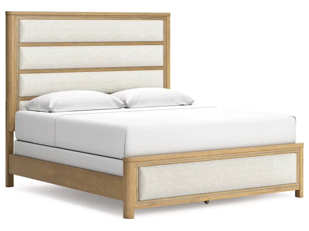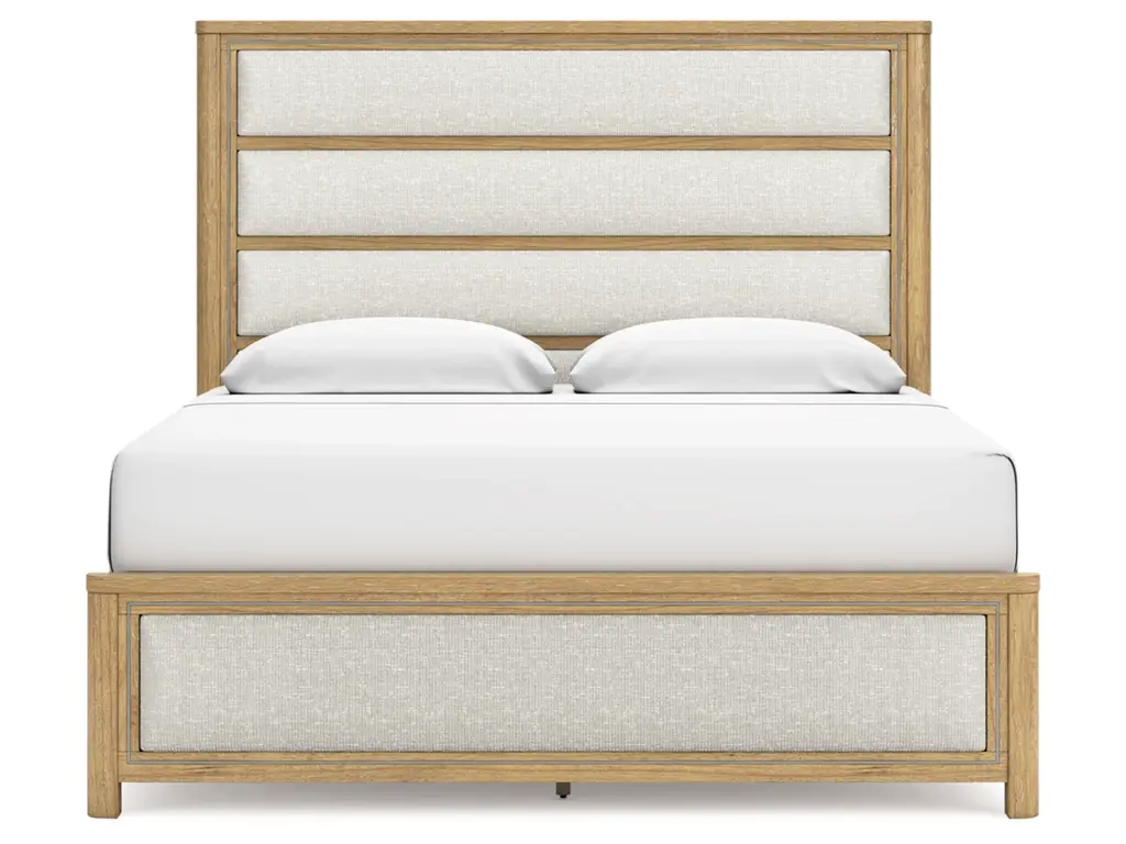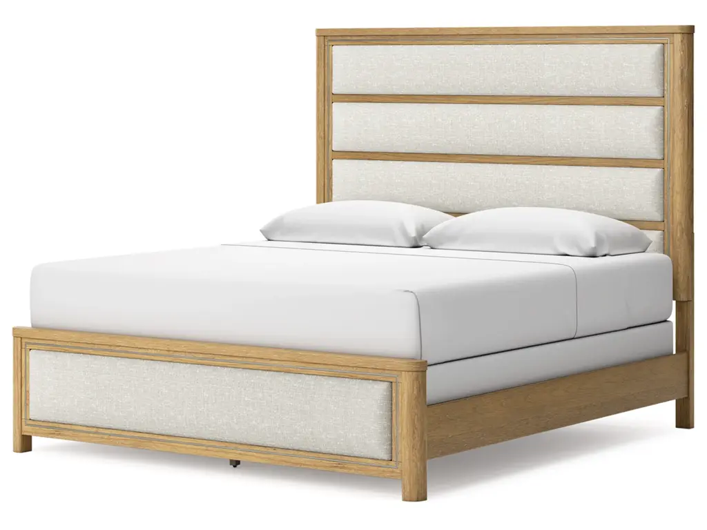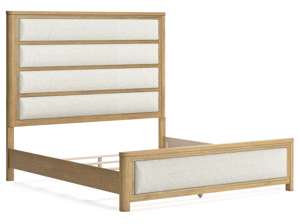 The Rencott king upholstered bed's classic yet contemporary good looks are hard to deny. Softly shaped posts and a light oak finish with wire-brushed wood grain texture lend an organic appeal to your soothing space. Horizontal headboard cushions add cozy dimension, and metal trim provides a subtly striking touch.