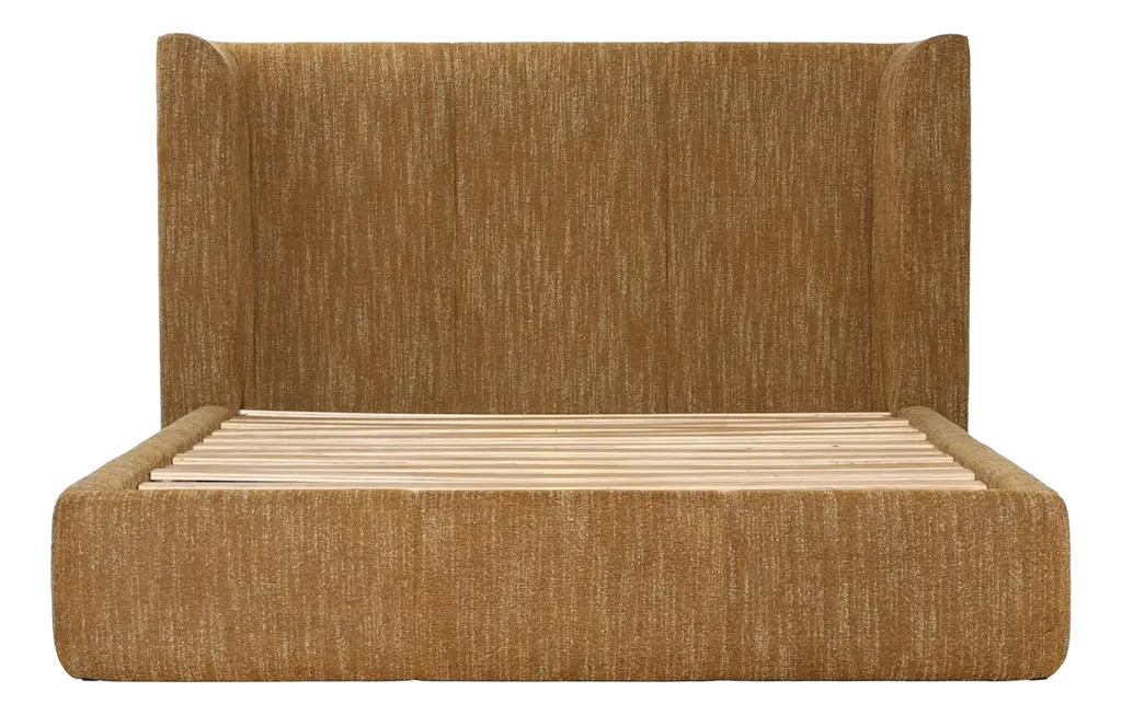 Contemporary luxe camel toned velvet upholstered bed frame in queen size. Soft polyester velvet fabric with birch wood frame. Rounded edges give this bed an elegant yet modern feel. Slats included. This bed weighs approx. 150 lbs.