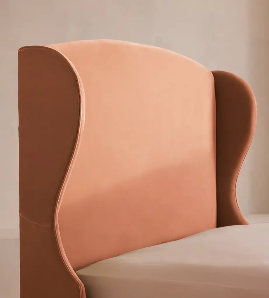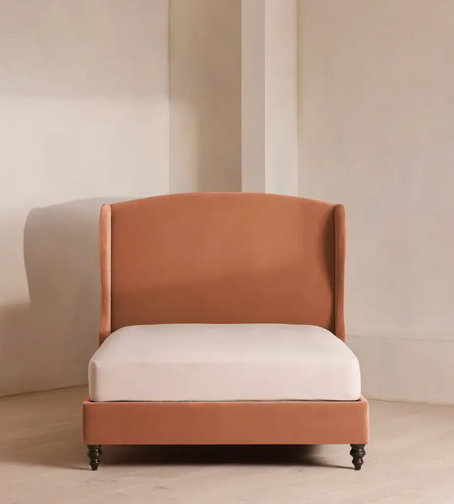 The oversized winged headboard of our Rivas bed helps create a cocooning effect for a good night's sleep. Handcrafted in the US, it's been upholstered in rich velvet and sits on dark, turned hardwood feet. Place in the center of the room as a feature piece with crisp bed linen and printed textiles to recreate the bedrooms of Soho House Barcelona.