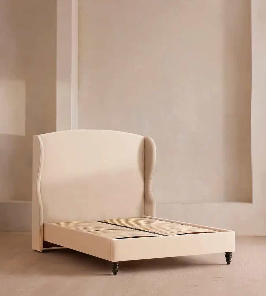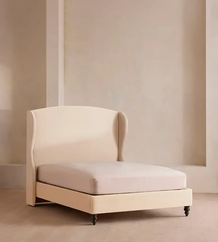 The oversized winged headboard of our Rivas bed helps create a cocooning effect for a good night's sleep. Handcrafted in the US, it's been upholstered in rich velvet and sits on dark, turned hardwood feet. Place in the center of the room as a feature piece with crisp bed linen and printed textiles to recreate the bedrooms of Soho House Barcelona.