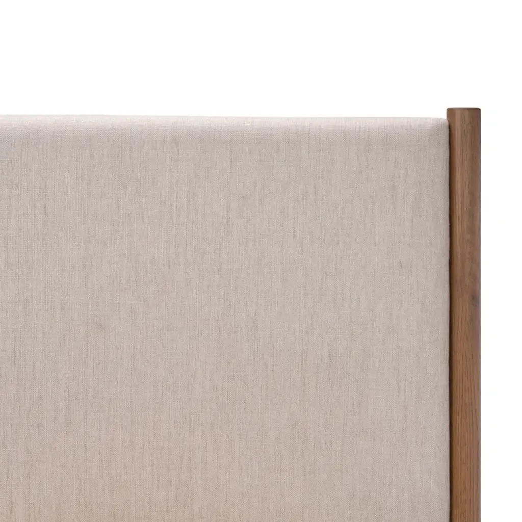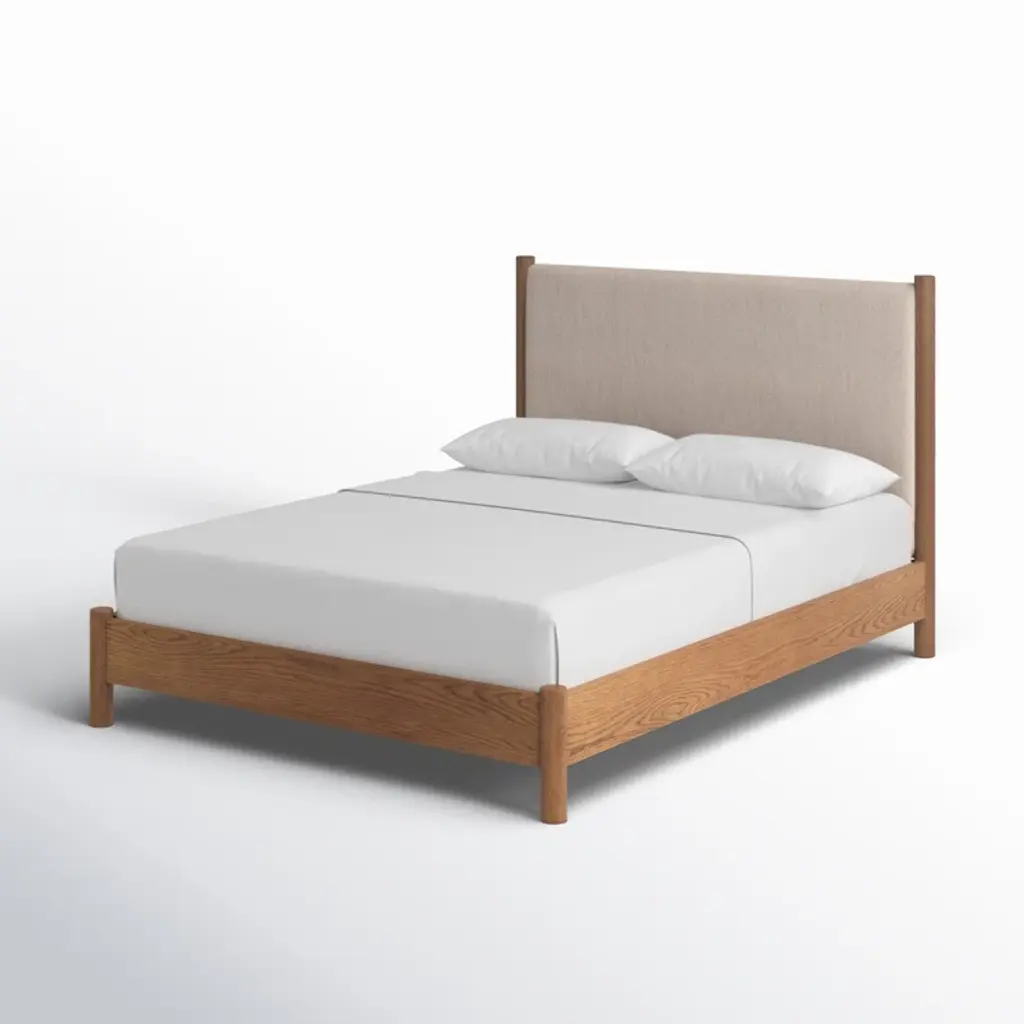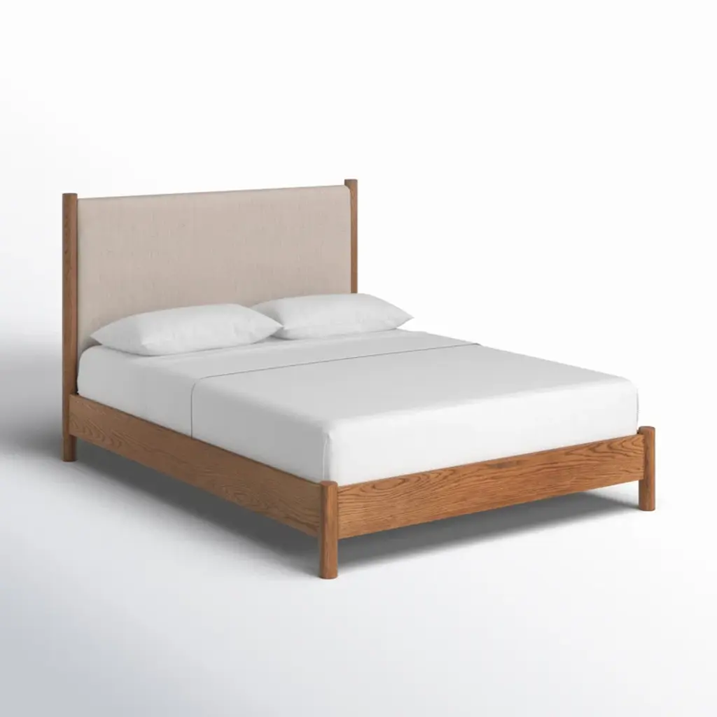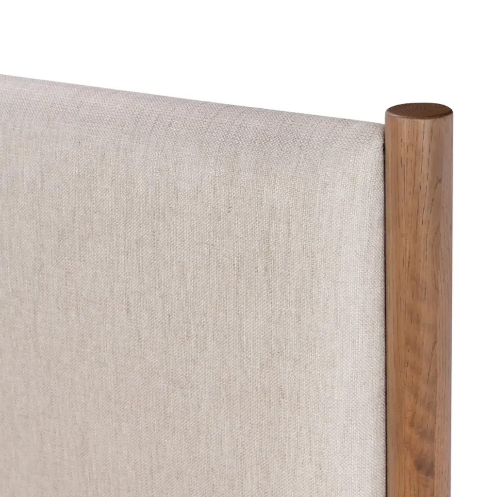 Rounded, chunky dowel legs in an amber oak finish frame the neutral, linen-like upholstered headboard of this bed frame.