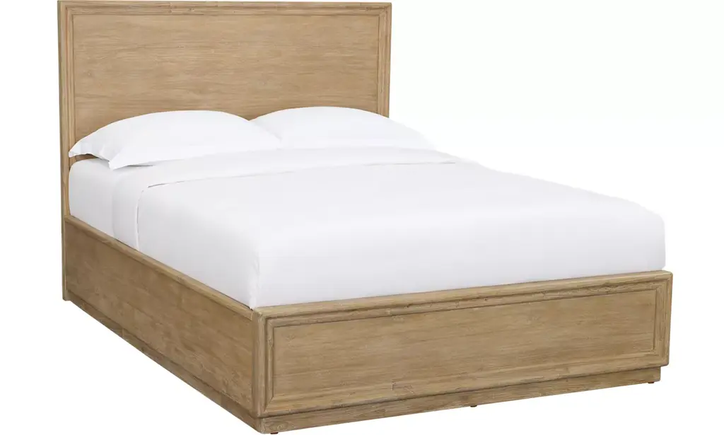 Embrace a vacation-state-of-mind with the Rosalie panel bed, built with a clean-lined headboard, a simplistic body and finished in a calming knotty oak hue.