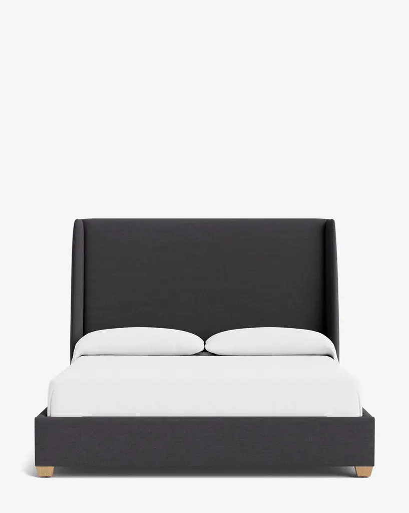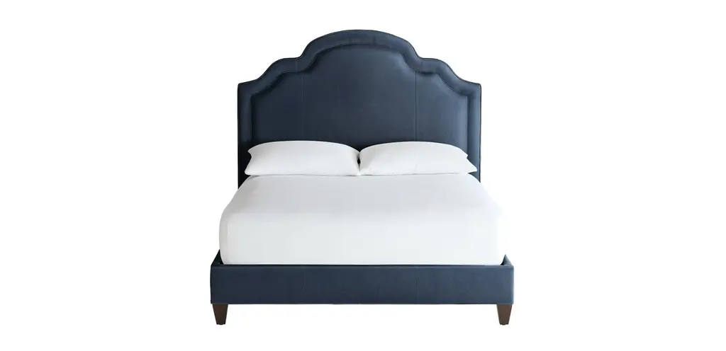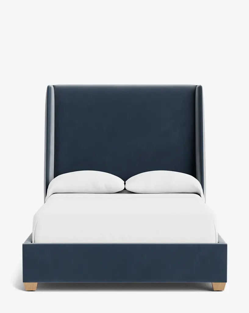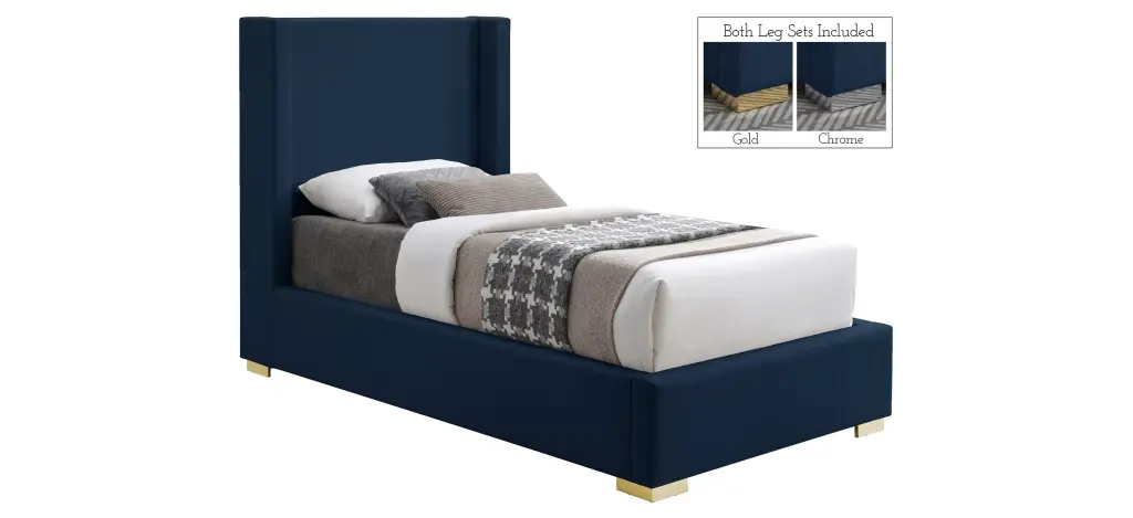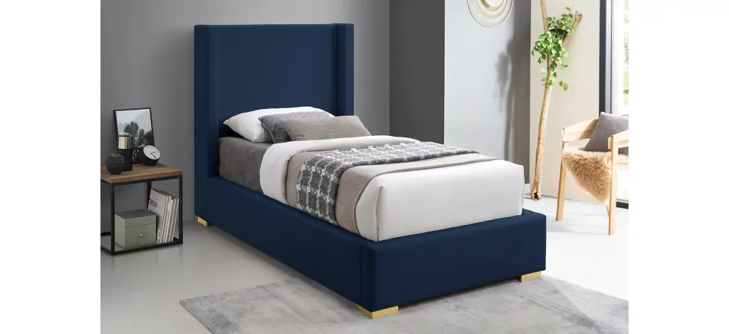 Royce Bed is the star of the show here, with its extra height adding an element of drama to this exceptionally crafted bed. The headboard, sides and footboard of this Royce bed are covered in rich navy linen textured fabric for a sleek yet chic touch. The bed comes with both gold and chrome legs to suit your style preferences.