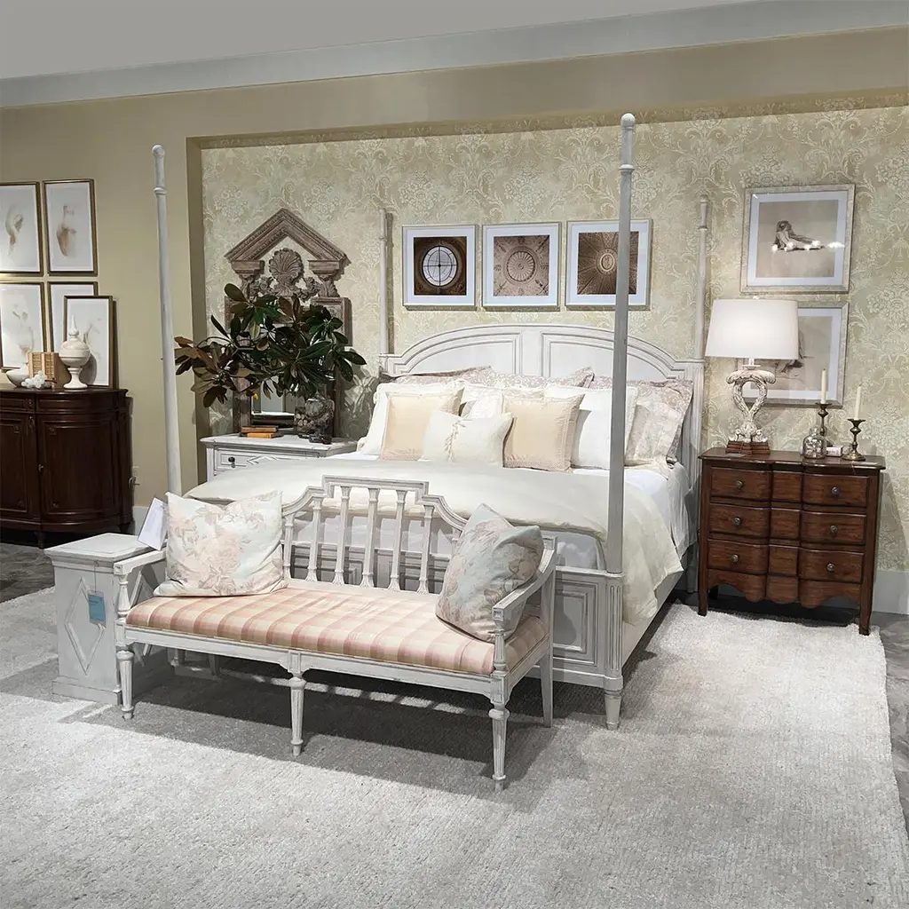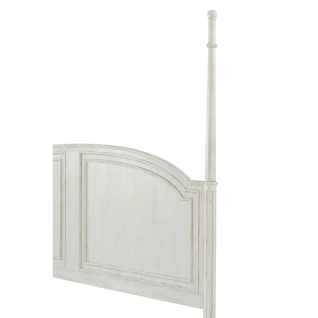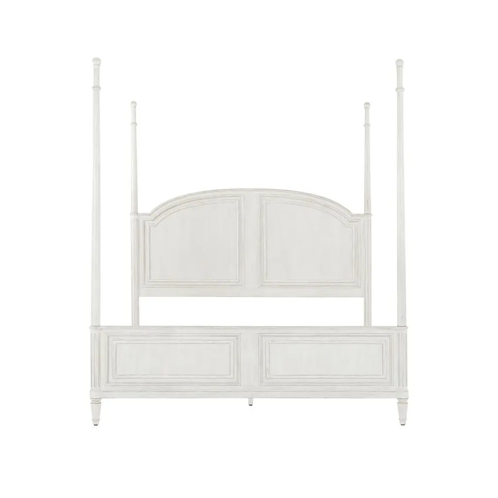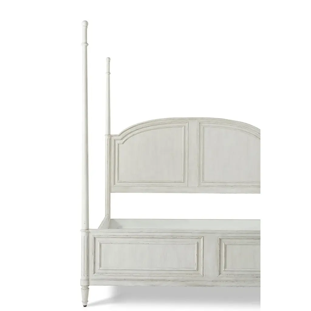 A Rustic white washed painted four post king size bed with carved arch panel headboard and paneled footboard with turned posts having ball finials and raised on fluted styles and turned and tapered feet.Dimensions: 81.5" W x 85.25" D x 89" HFor US King mattress - 76 x 80"Cappings for high-low / low-low included.