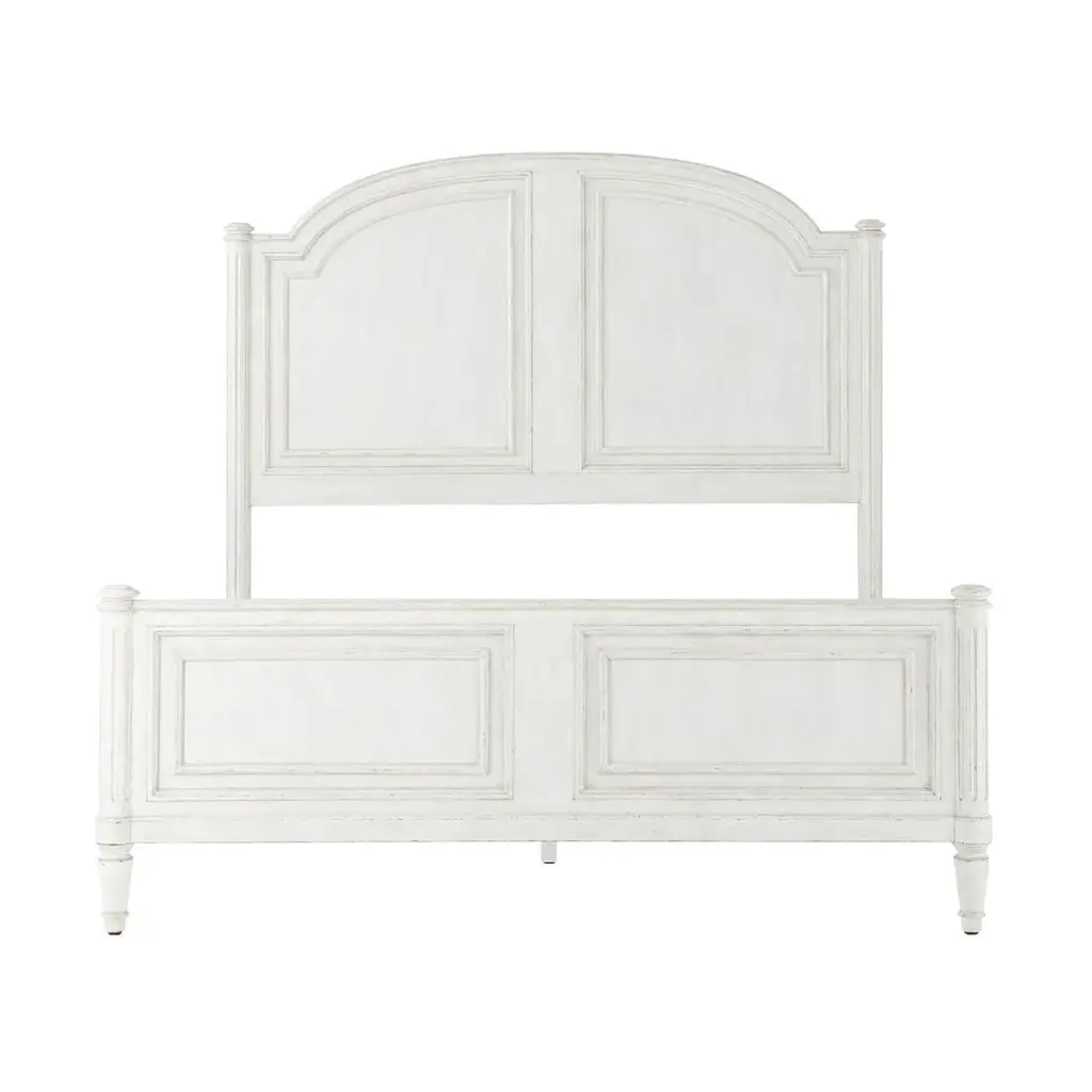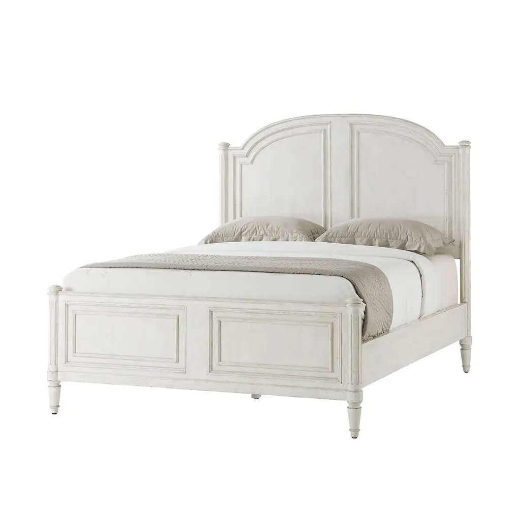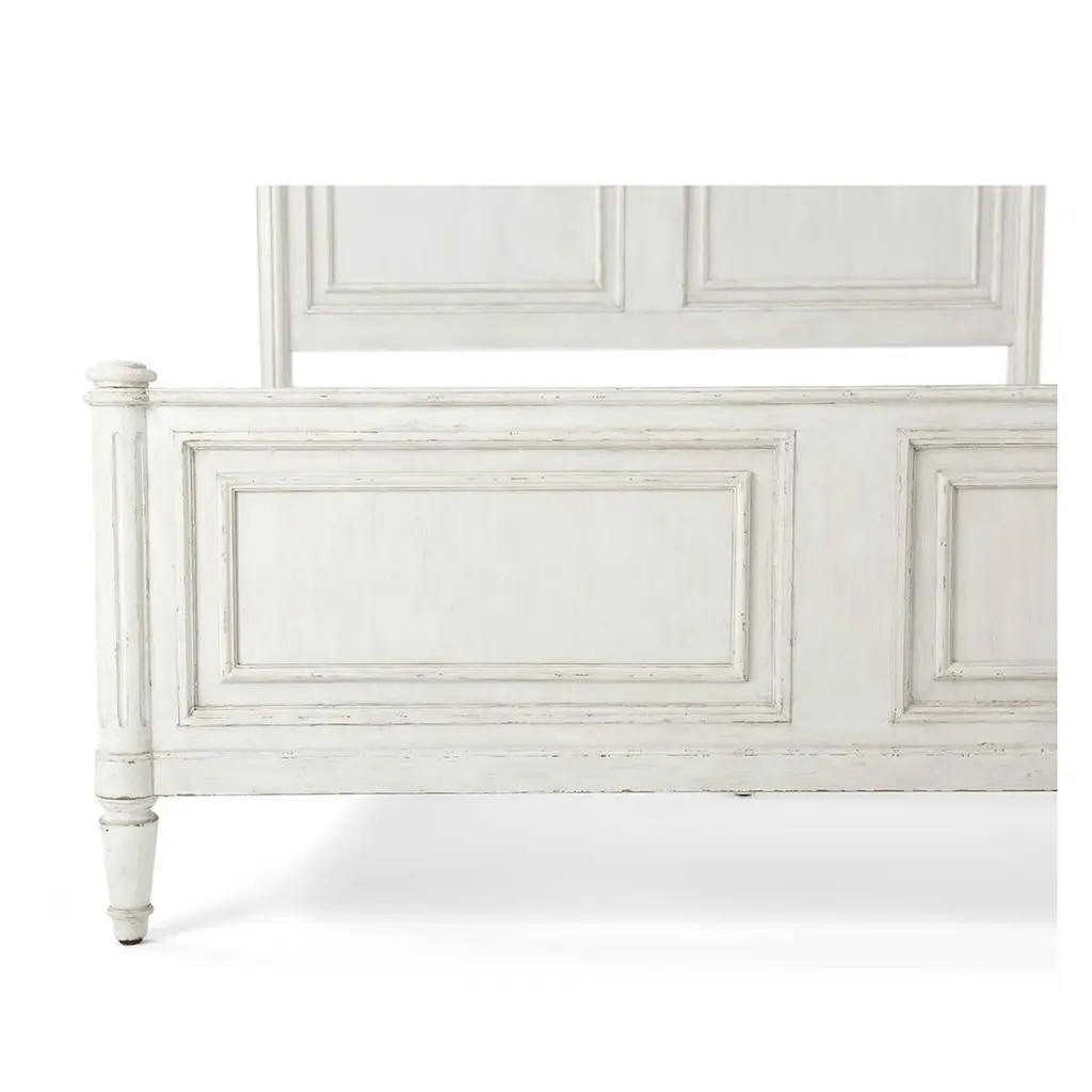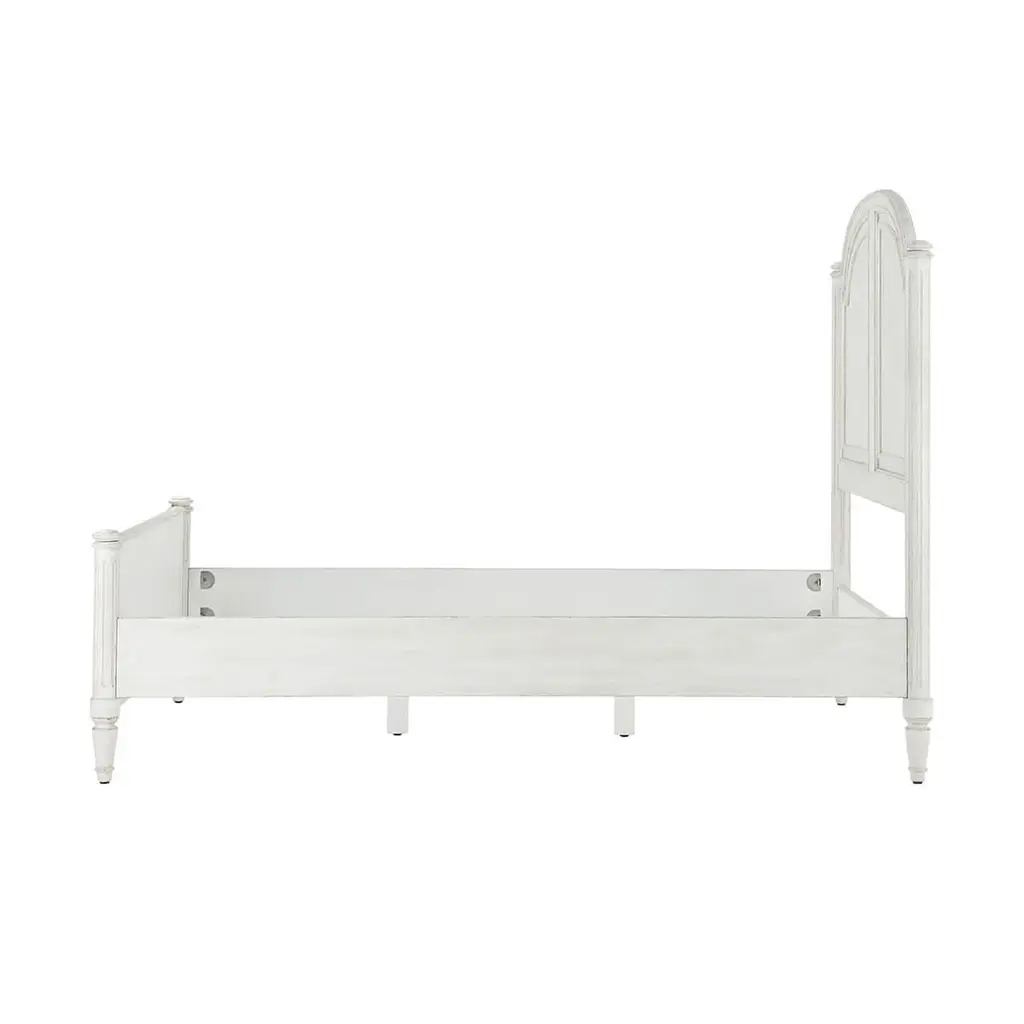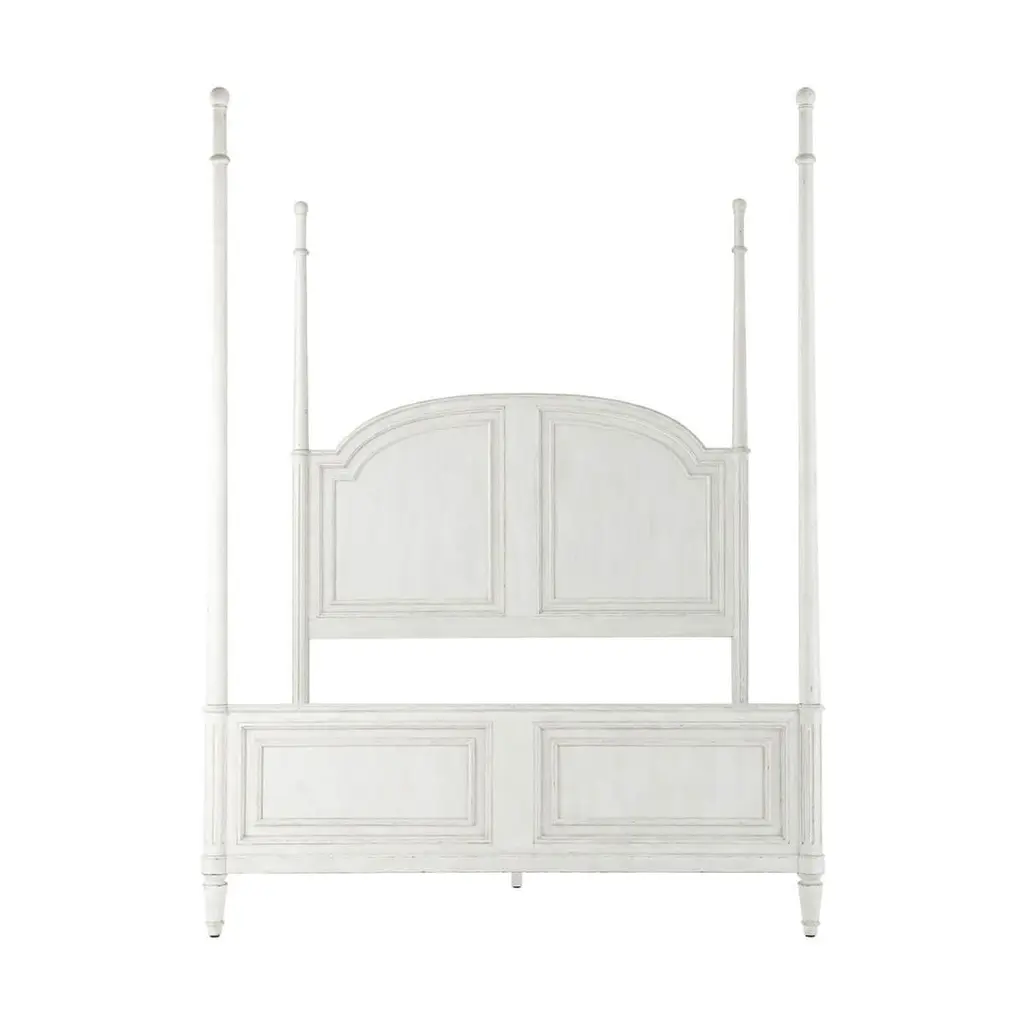 A white washed painted four post queen size bed with carved arch panel headboard and paneled footboard with turned posts having ball finials and raised on fluted styles and turned and tapered feet.Dimensions: 65.75" W x 85.25" D x 89" HFor Cali King mattress - 60 x 80" Cappings for High-Low / Low-Low IncludedPlease note the finish on this piece is distressed.