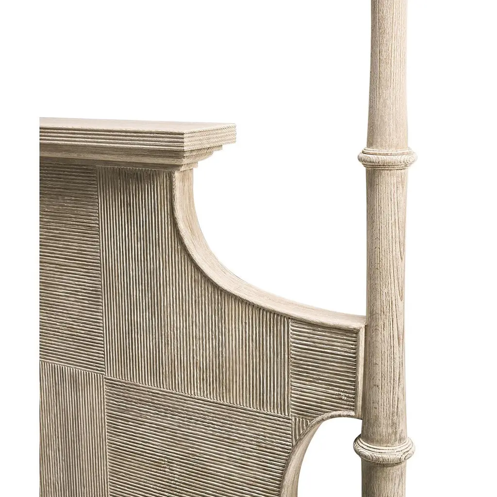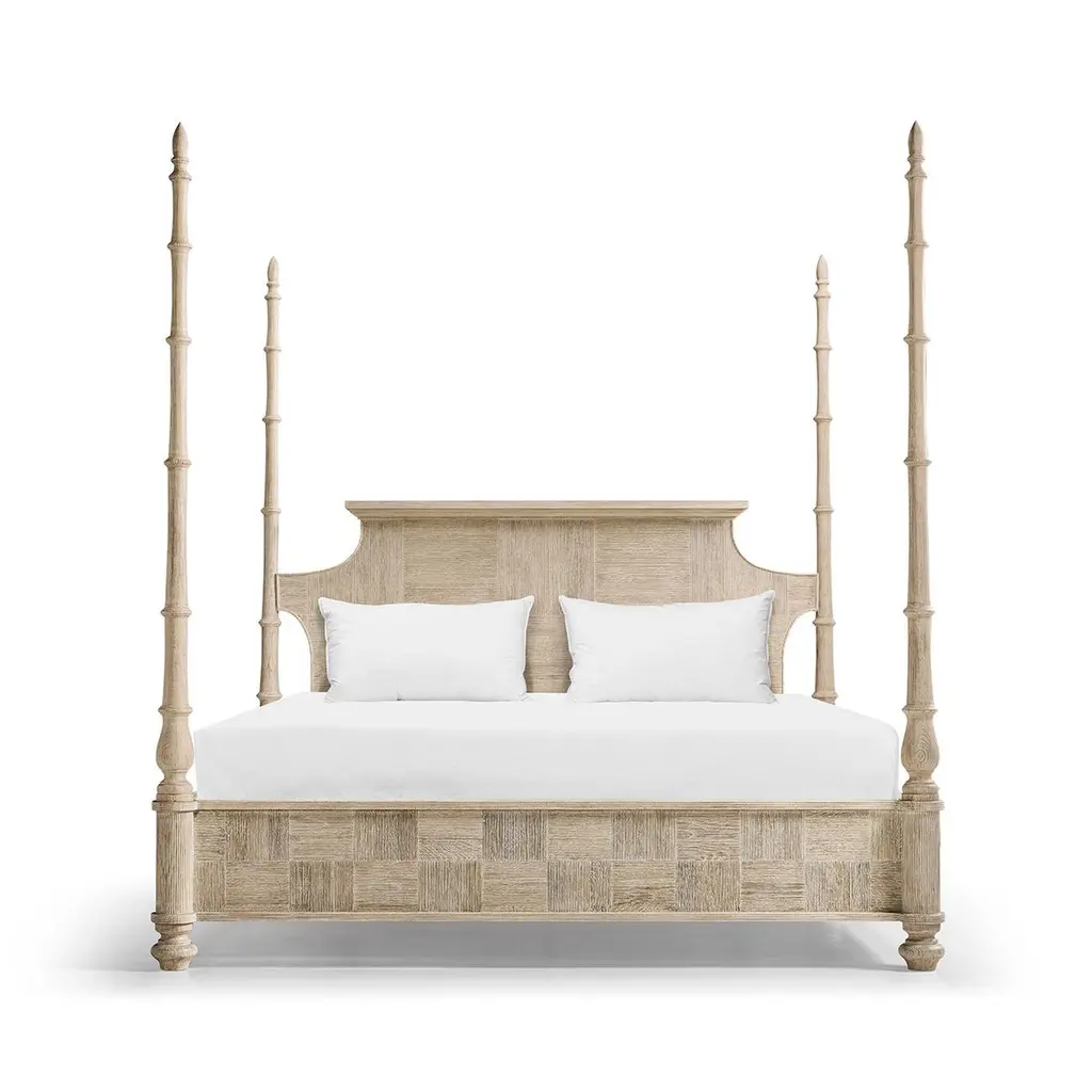 Crafted with a distinctive reeded wood parquet pattern, this bed radiates refined elegance while maintaining a relaxed, transitional appeal. The washed acacia finish enhances the natural grain of the wood, bringing warmth and texture to any interior. Versatile in design, this poster bed features removable posts, allowing you to customize its look to suit your style. Whether embracing its full grandeur in a classic setting or opting for a more streamlined silhouette, this piece easily adapts to your space. Perfect for coastal retreats, classic style, or modern bedrooms, the bed is a statement of sophistication and comfort.Dimensions: 85.625" W x 89.25" D x 92" H