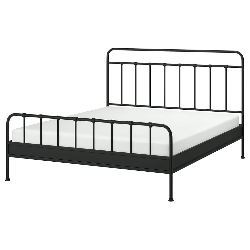 SAGSTUA Bed frame - black/Lönset Full. Brass-colored details on the headboard, footboard and legs give a unique twist to this classic design. The powder-coated steel frame is strong, sturdy and easy to maintain. The high footboard keeps bed textiles from falling onto the floor while you sleep.