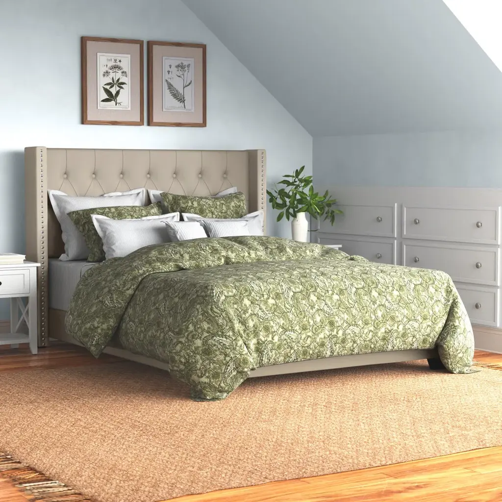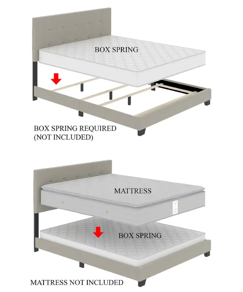 About This Product Set a glamorous foundation in your bedroom with the help of this bed. It's built with a solid and engineered wood frame and features an understated side rail and footboard with flared legs. The bold headboard has a clean-line wingback design and is wrapped with a foam filling for some extra cushion behind your head. Button tufting decorates the headboard, and a nailhead trim lines the side for added traditional glam. This bed arrives with a few slats, so we recommend using a box spring under your choice of mattress. Features The beautiful piece comes with a classic upholstered Looks luxurious and makes an excellent addition to any bedroom Never out of style Inner dimensions (King): 77" W x 81" L